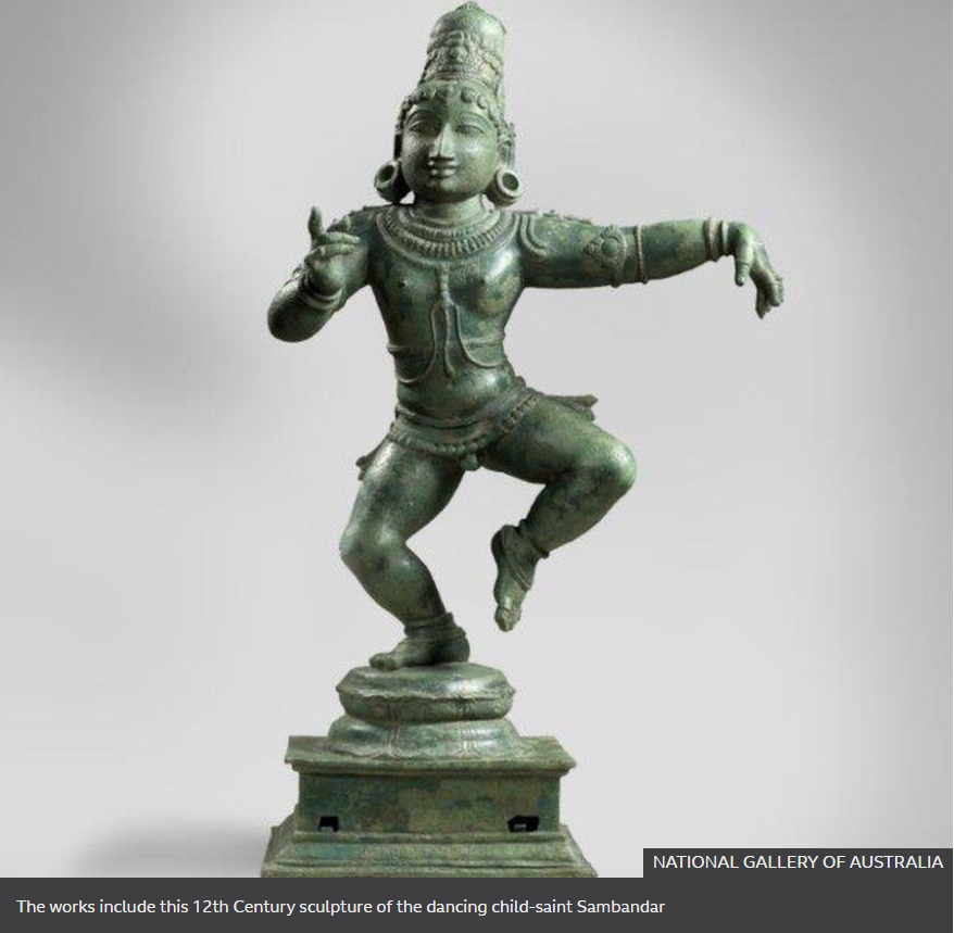 도난품 중에는 12세기 Chola 왕조 Tamil Nadu 지역에서 번성한 힌두미술품이 있는 모양이라 보도에서 대문으로 내세운 사진 속 조각이 그 주인공이라, 이를 BBC에서는 sculpture of the dancing child-saint Sambandar 라 한다. 춤추는 어린 성자 삼반다르? 뭐 이런 뜻이 아닌가 한다.