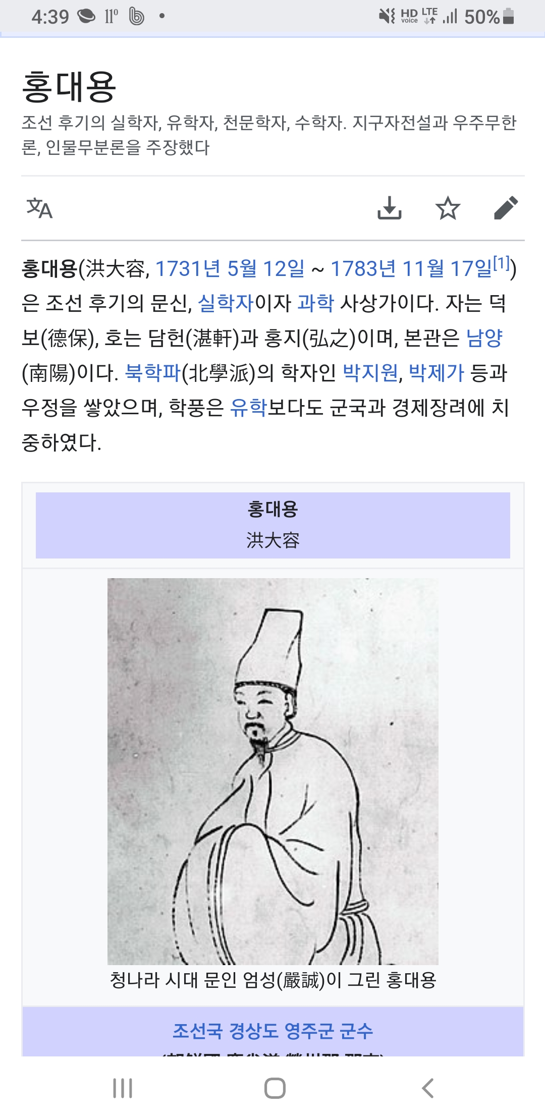 예컨데 구글위키피디아에서 홍대용을 검색하면 아래와 같거니와