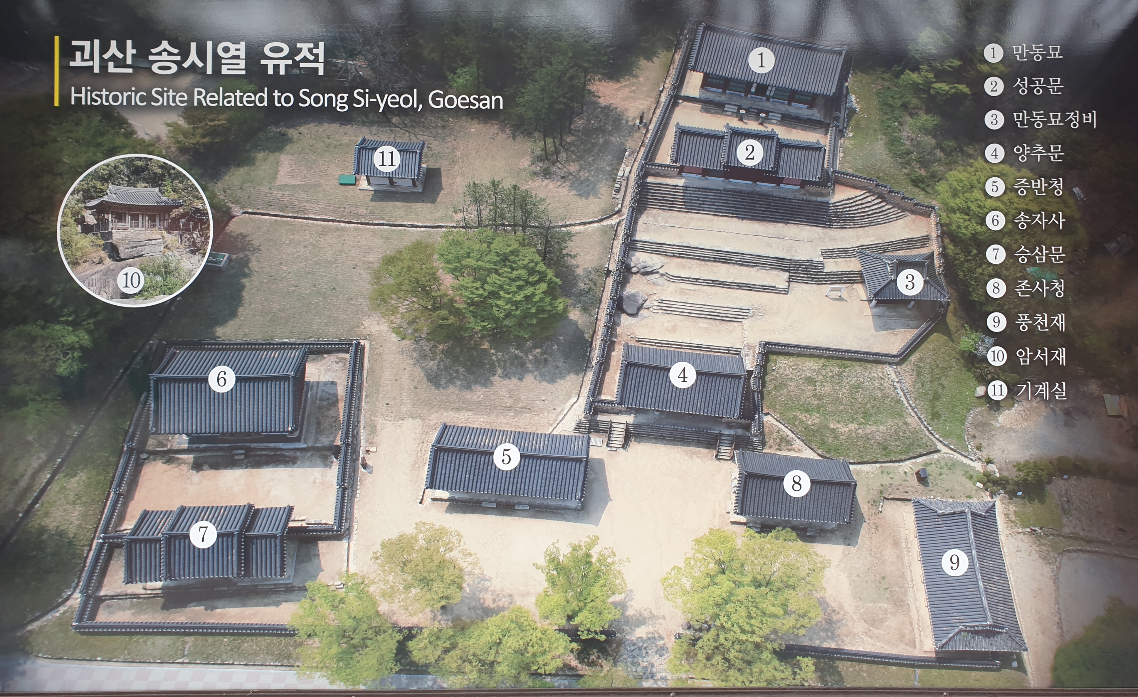 송자사는 건물 전면에서 바라보는 사람 기준으로는 서원 왼편이나 이는 조선시대 관념으로는 우측이다. 어디 시건방 지게 쳐다보는 사람 기준으로 따진단 말인가? 이 서원은 송시열을 추숭하는 신성공간이다.