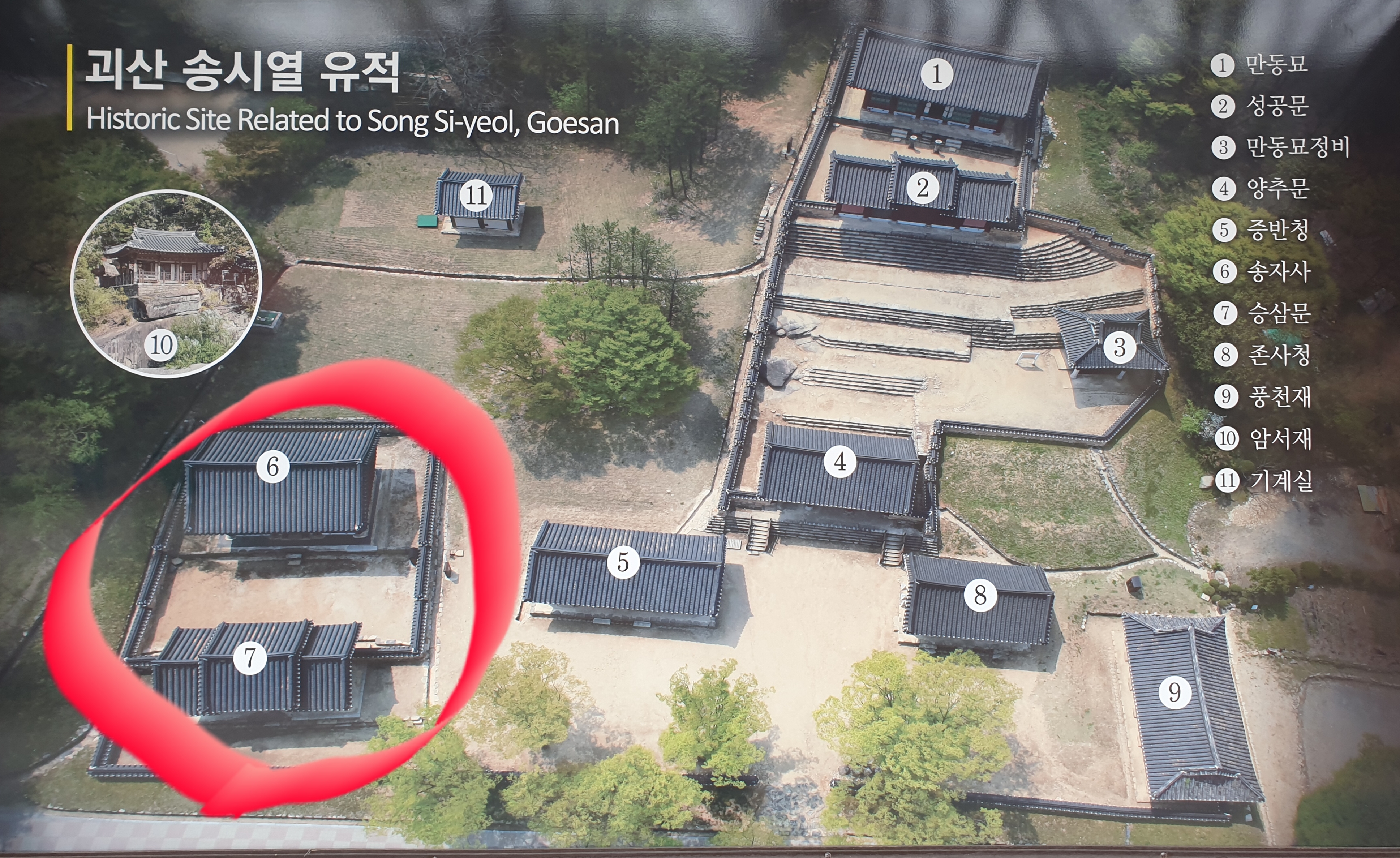 송자사는 건물 전면에서 바라보는 사람 기준으로는 서원 왼편이나 이는 조선시대 관념으로는 우측이다. 어디 시건방 지게 쳐다보는 사람 기준으로 따진단 말인가? 이 서원은 송시열을 추숭하는 신성공간이다.