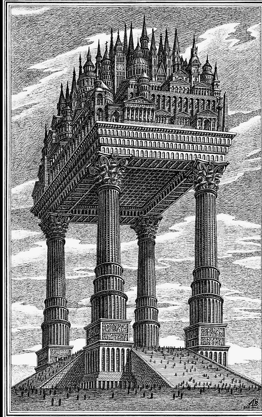 공중에 떠 있는 것처럼 보이는 우뚝 솟은 구조물들은 중력과 재료의 한계를 넘어 건축의 가능성을 탐구하려는 작가의 관심을 반영한다.