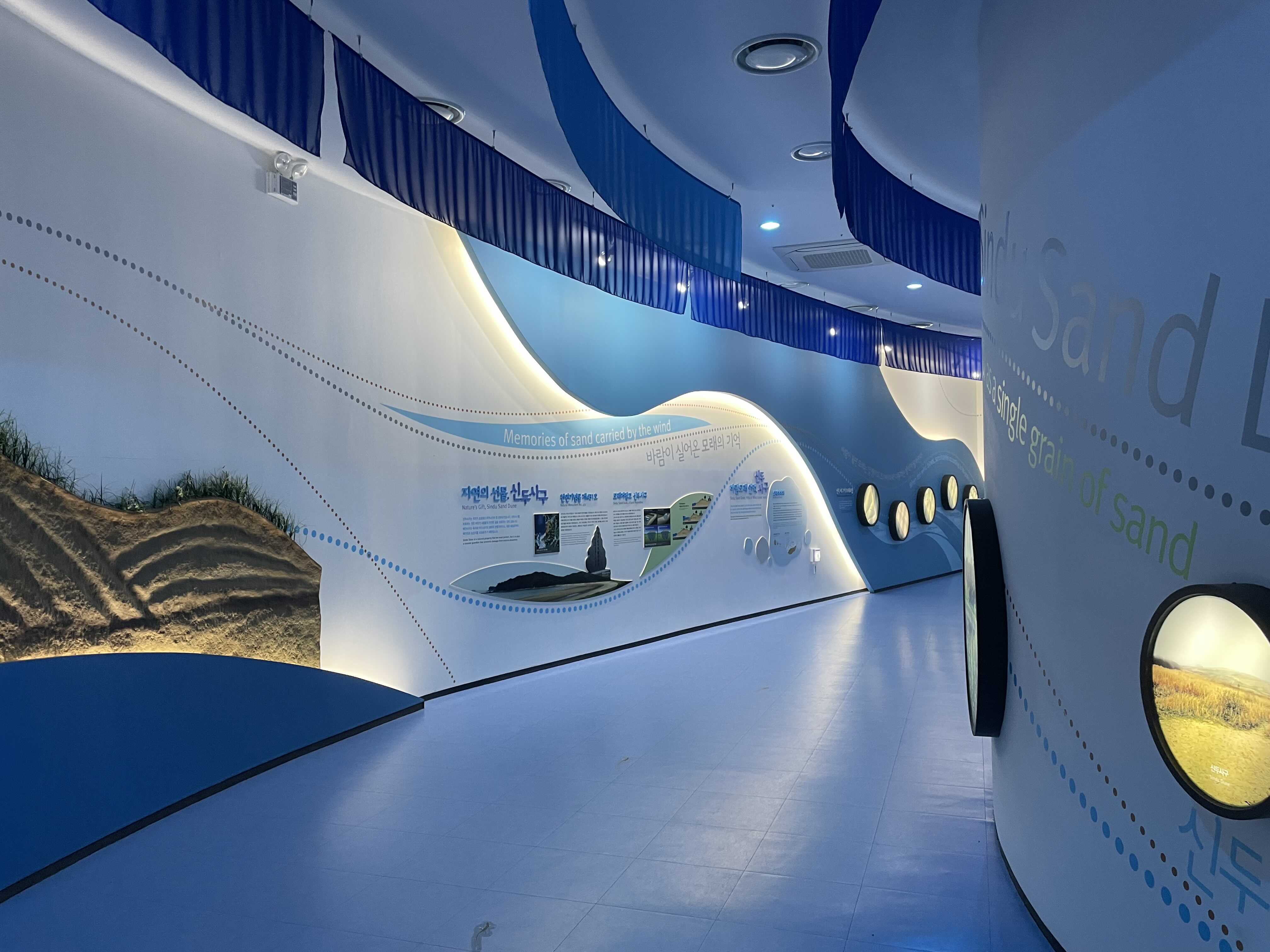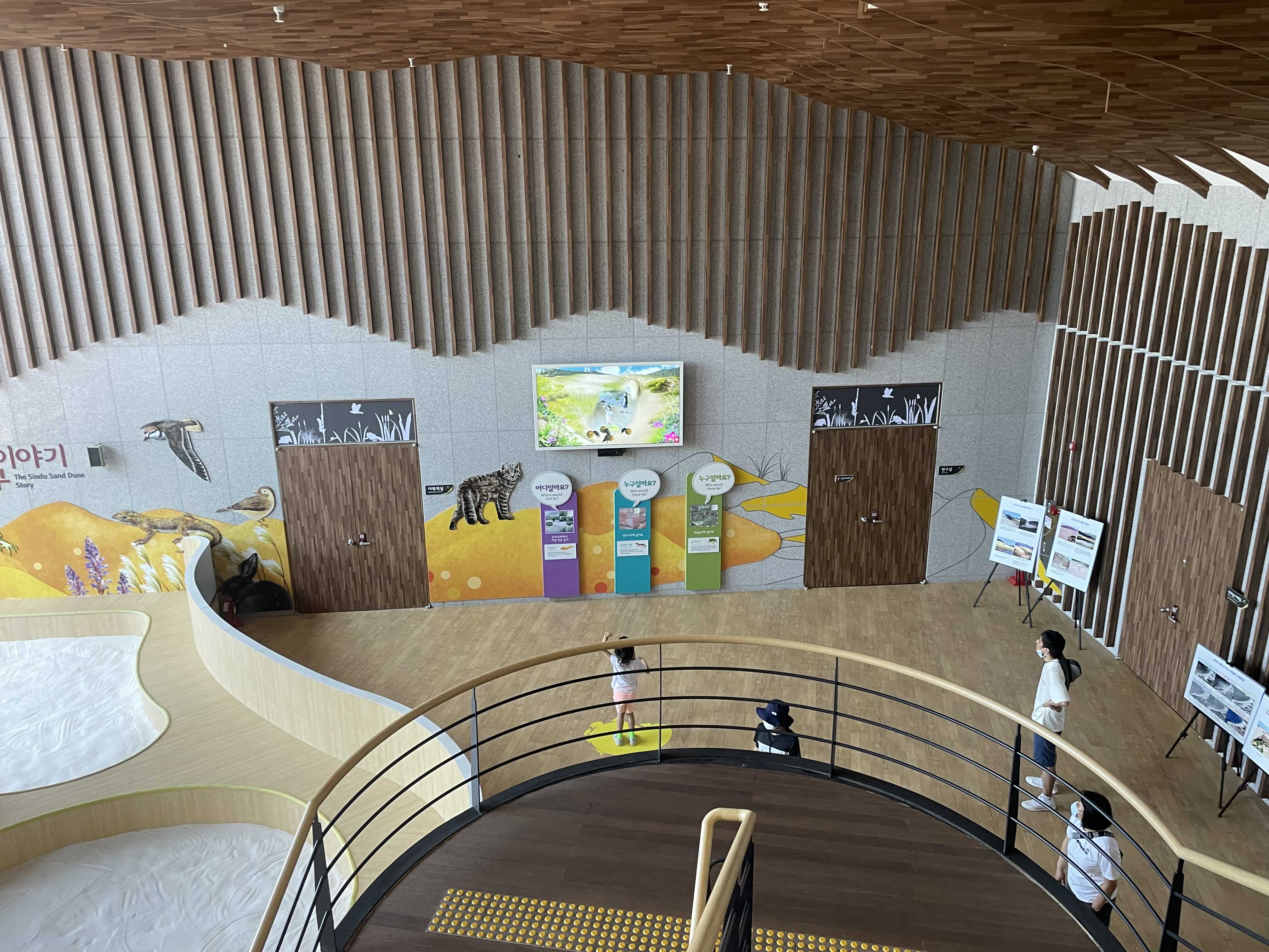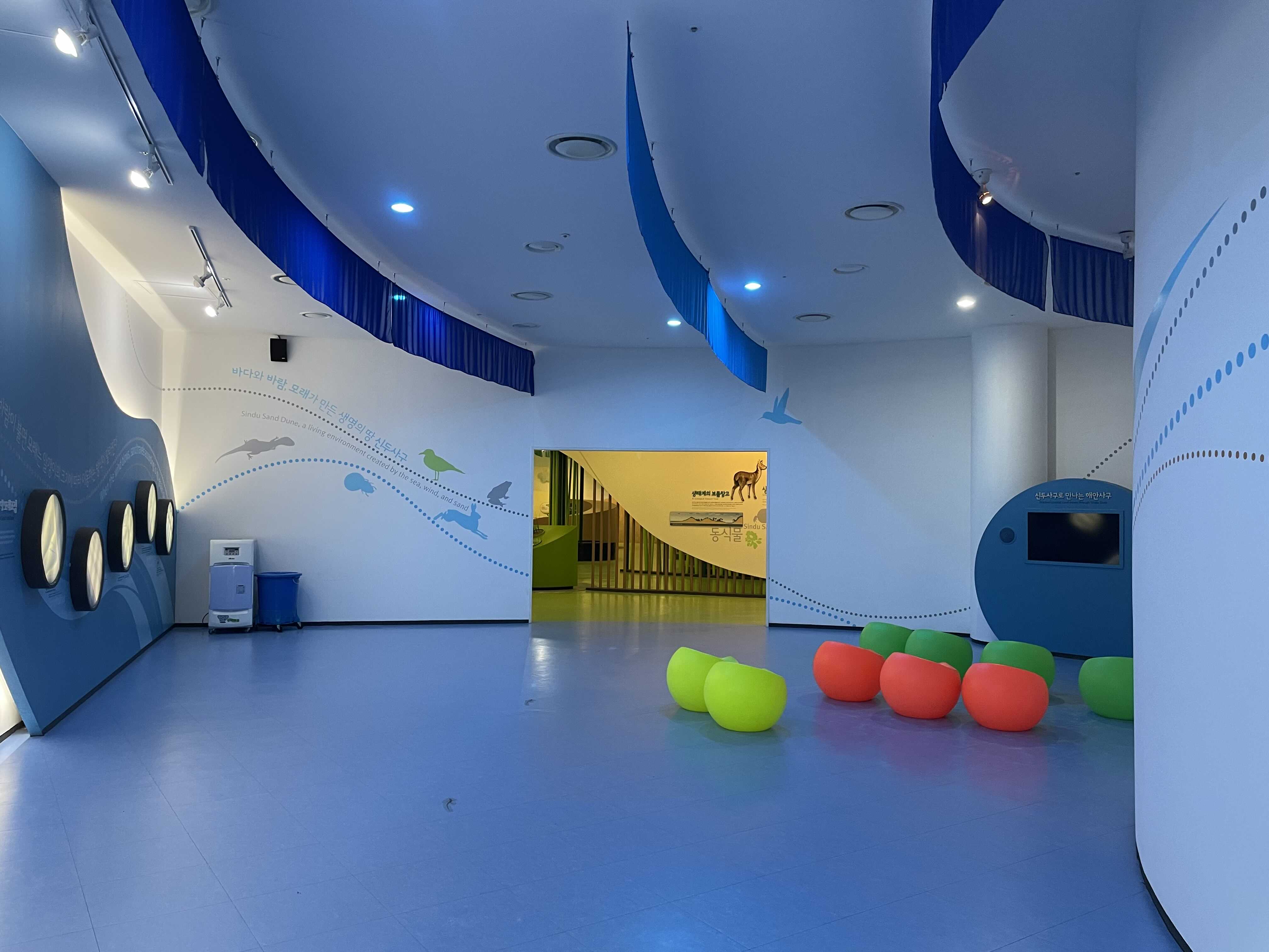 이렇게 위 천장부터 아래 바닥까지 모두 사용하는 공간은 과학관 전시처럼 천장에 전시물을 매달아 아래로 늘어뜨리는 방법이 효과적이지 않을까 생각합니다. 신두리 해안사구에 날아드는 새, 곤충, 꼭 날개가 있는 것들이 아니라 도마뱀, 동물도 의외로 재밌을 것 같고요.