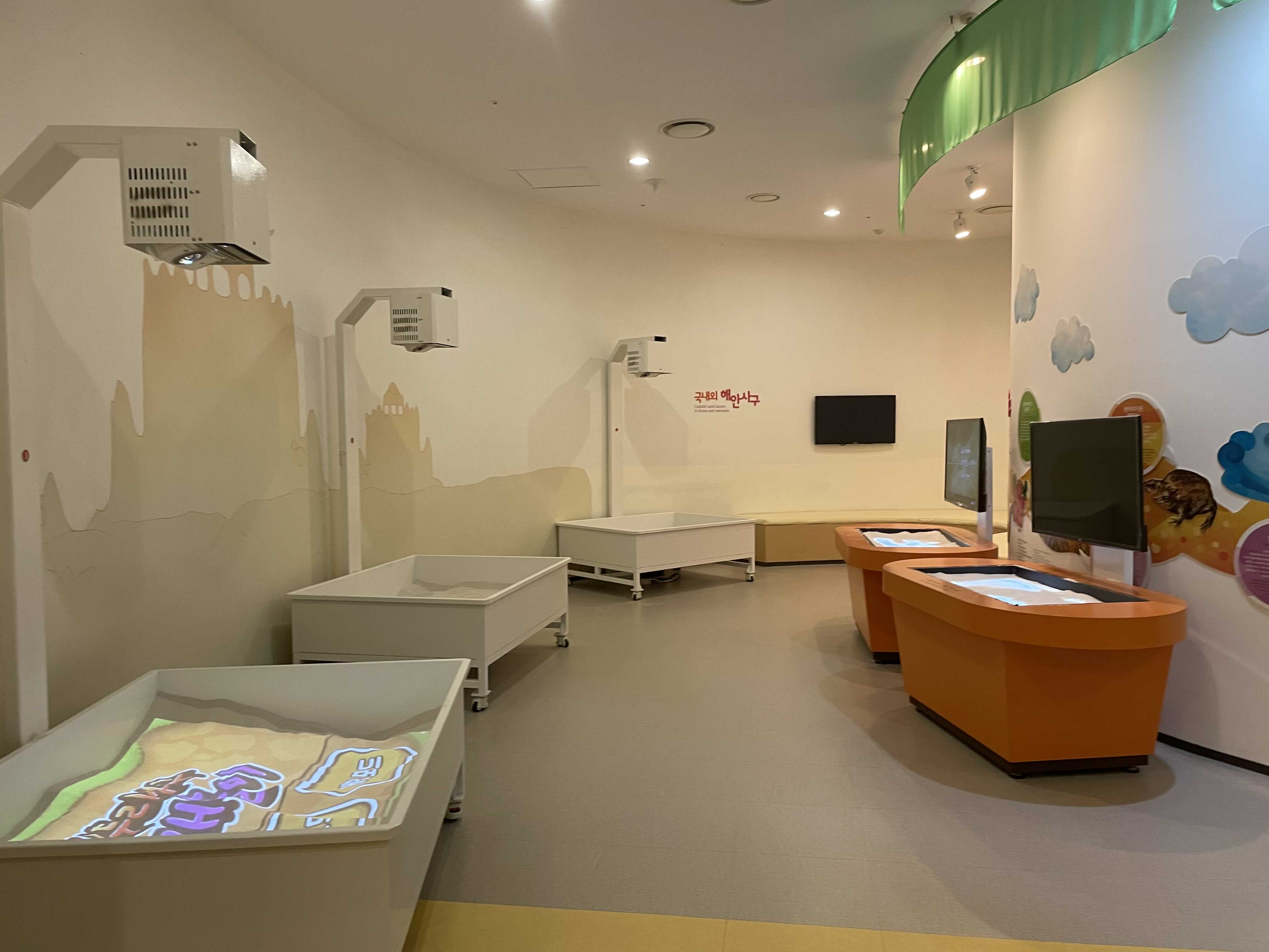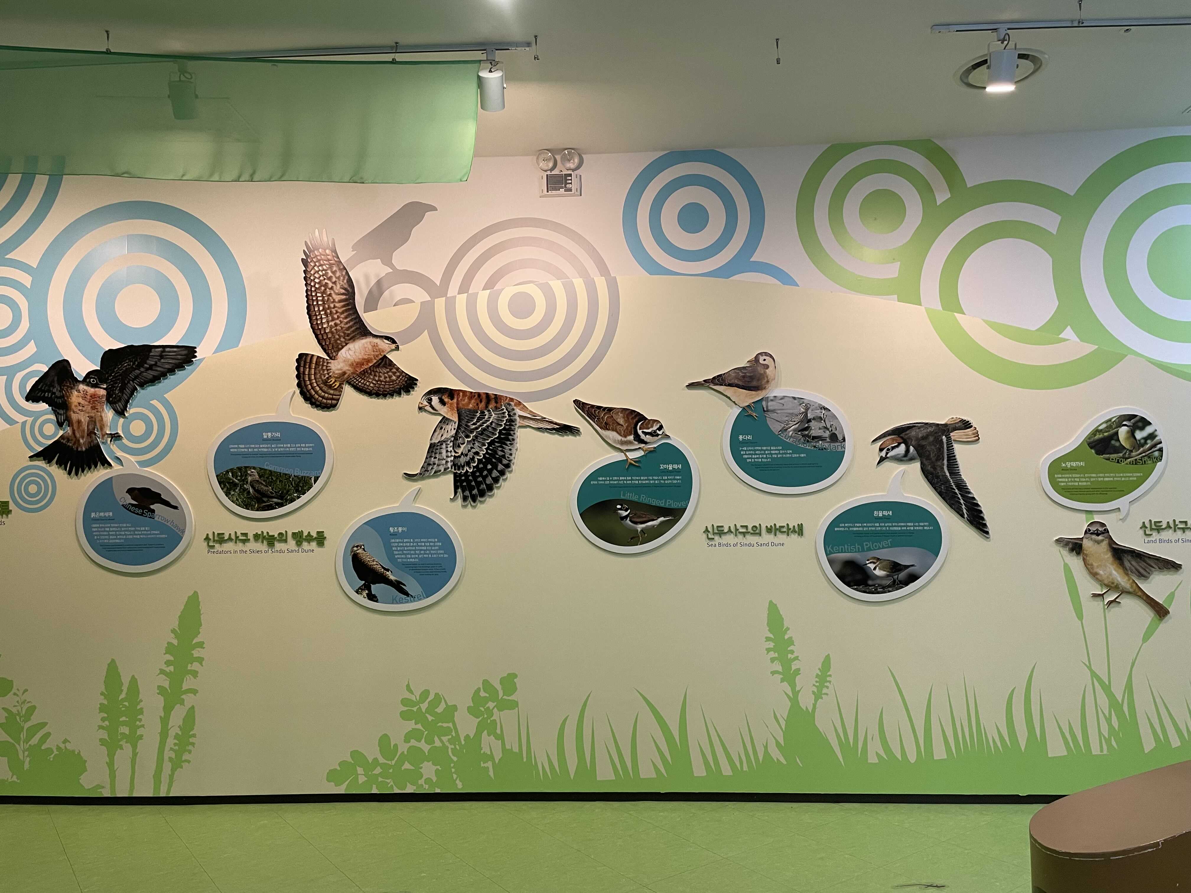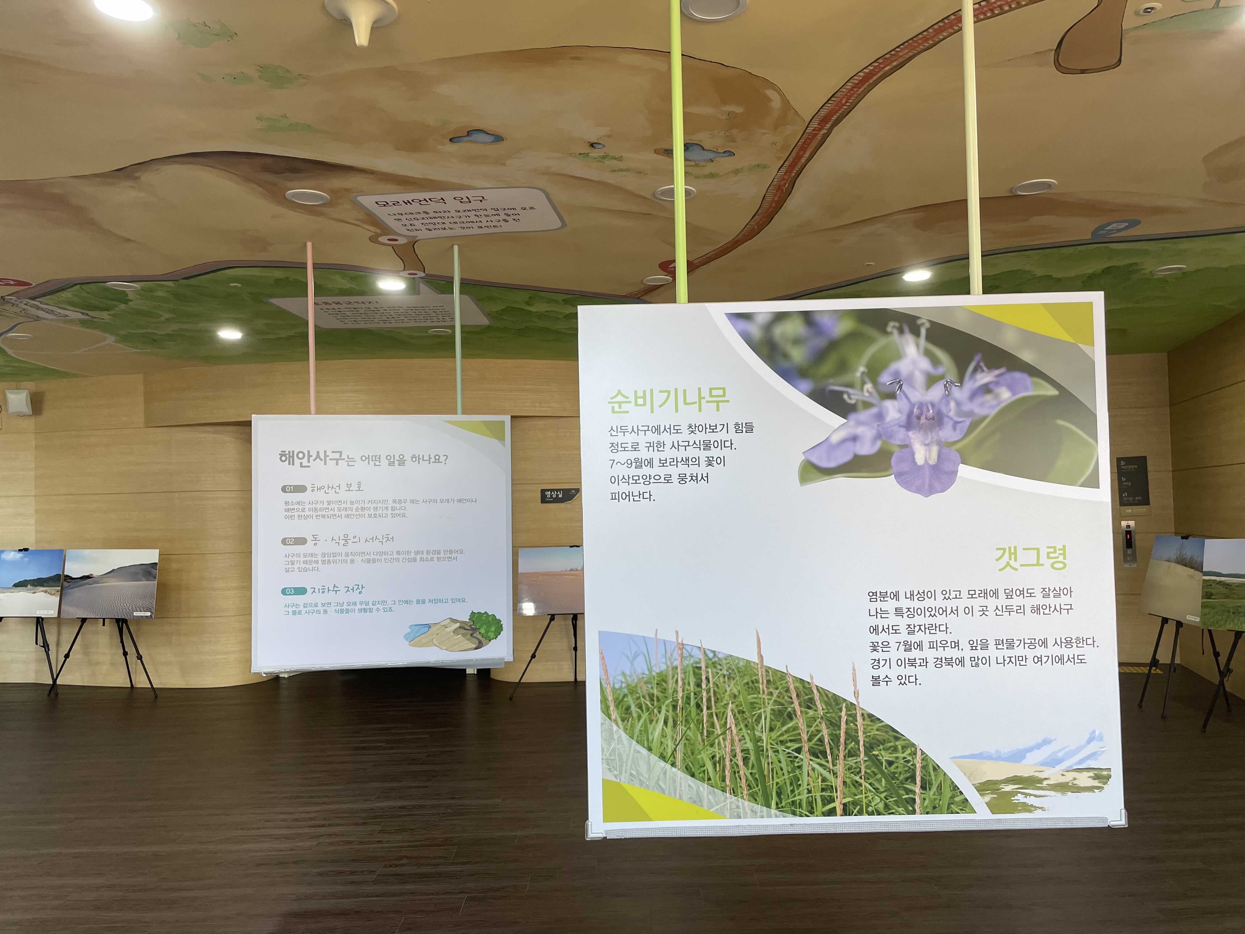 이렇게 위 천장부터 아래 바닥까지 모두 사용하는 공간은 과학관 전시처럼 천장에 전시물을 매달아 아래로 늘어뜨리는 방법이 효과적이지 않을까 생각합니다. 신두리 해안사구에 날아드는 새, 곤충, 꼭 날개가 있는 것들이 아니라 도마뱀, 동물도 의외로 재밌을 것 같고요.