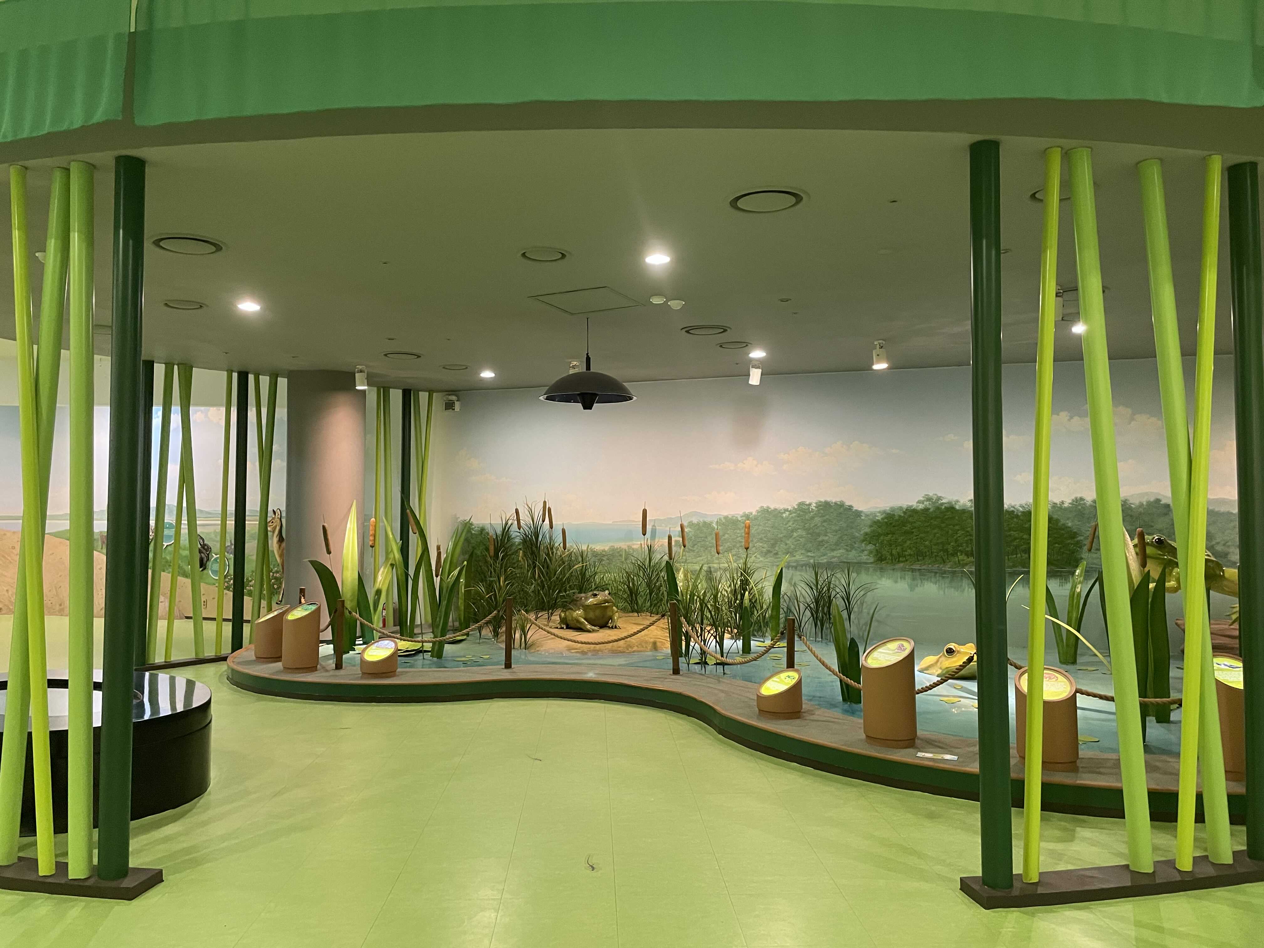 천장에 두웅습지를 표현했고 길을 따라 가다보면 습지에 살고 있는 생물들을 아래로 내려뜨리는 패널을 활용해 보여줍니다.