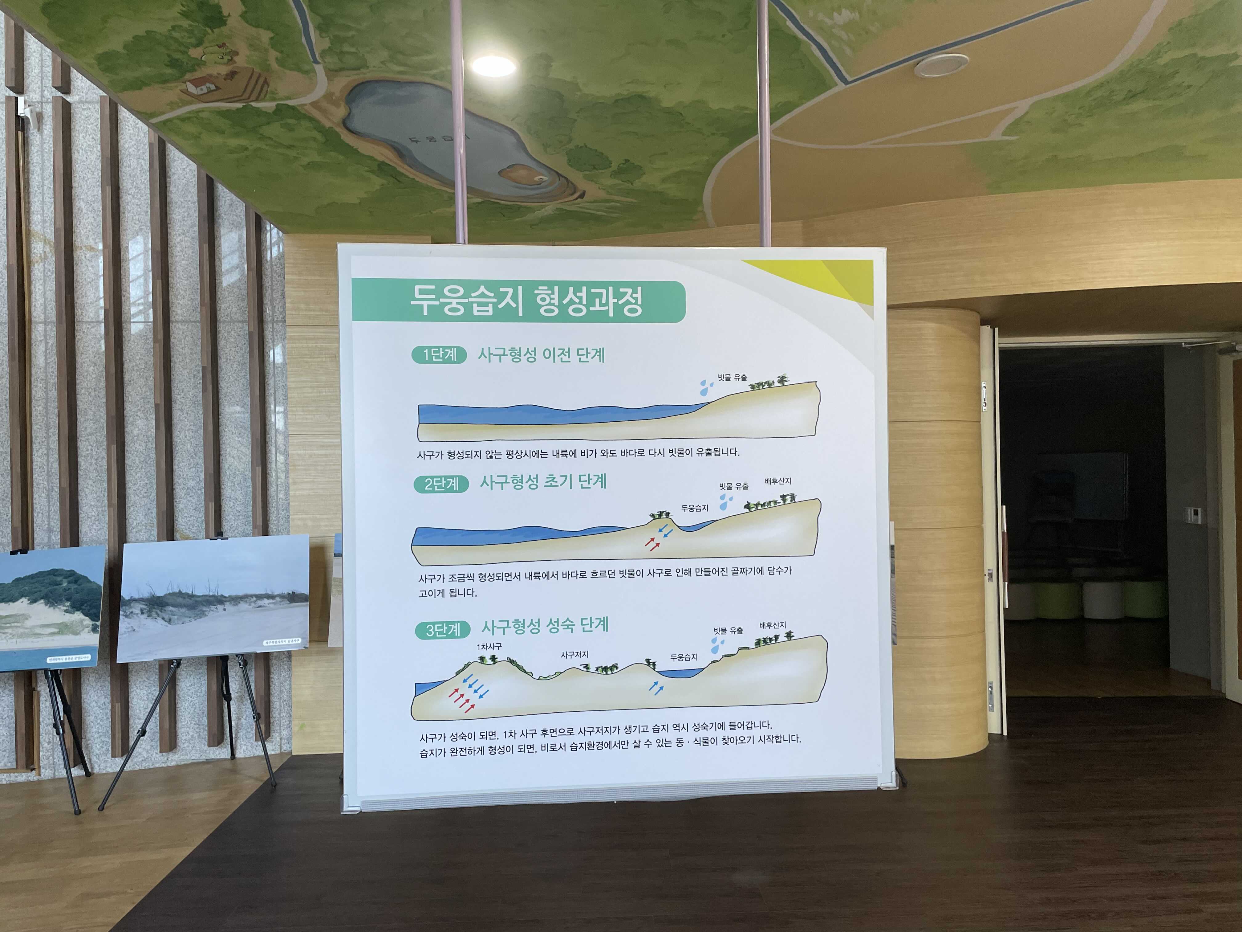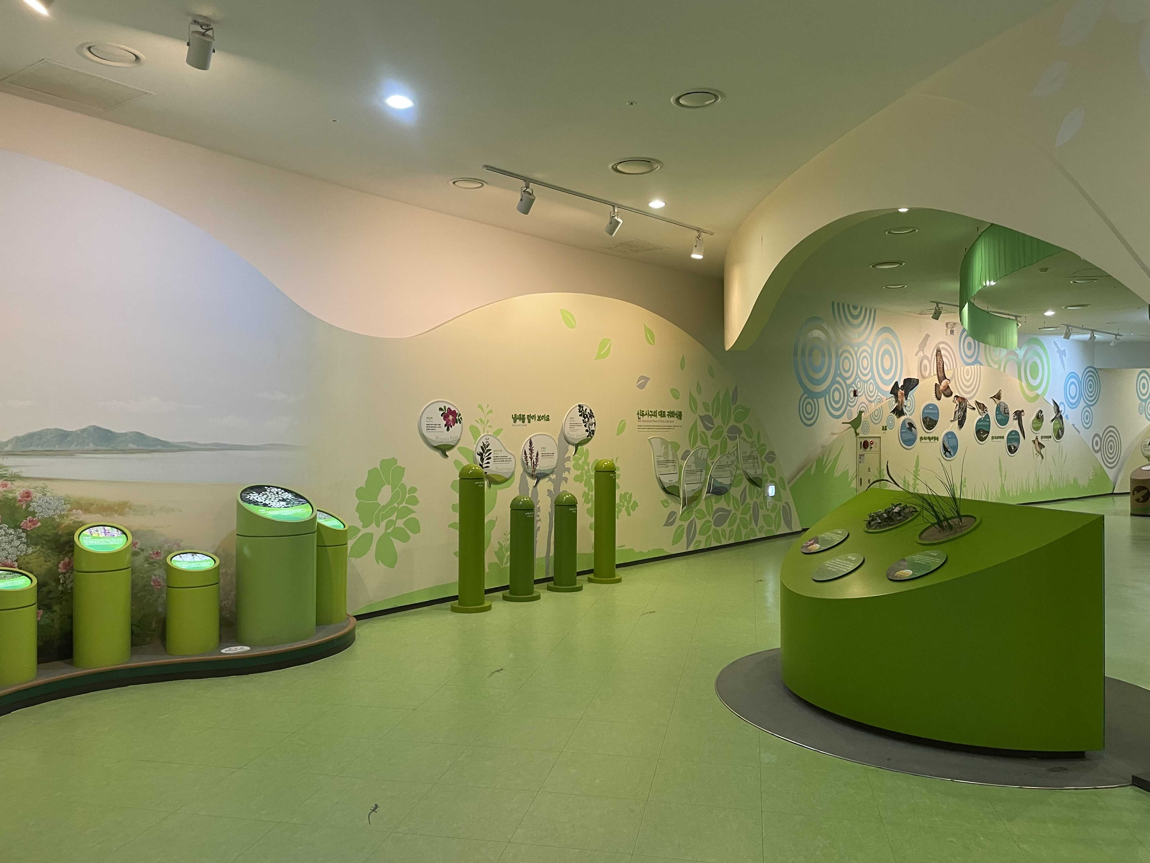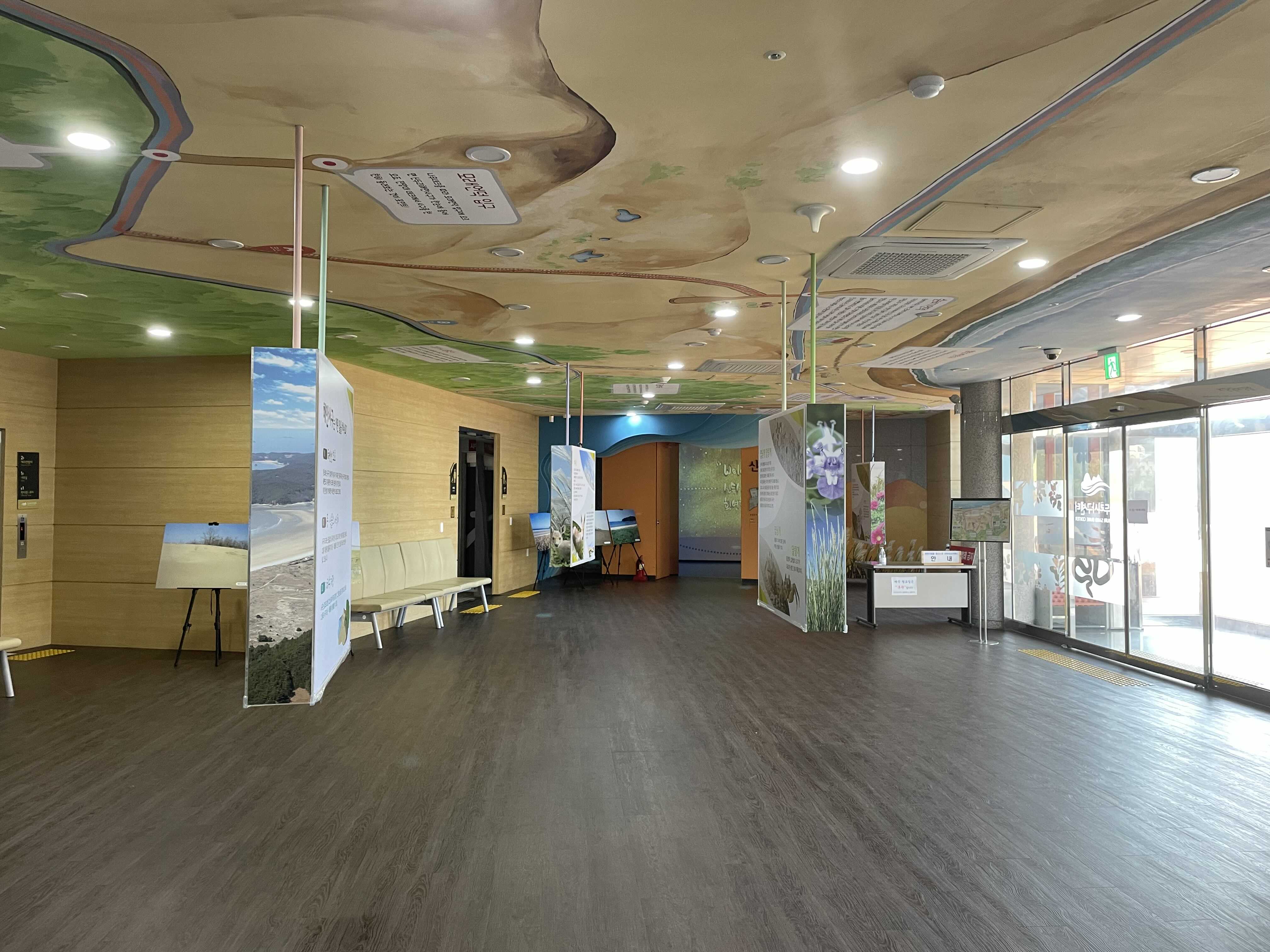 천장에 그려진 두웅습지를 따라 전시를 보라고 하는건지, 아니면 아래로 쭉 내려와 있는 패널을 보고 고개를 들어 천장에 그려진 두웅습지를 보라고 하는 건지 잘 모르겠습니다. 분명한건 고개가 아픕니다.