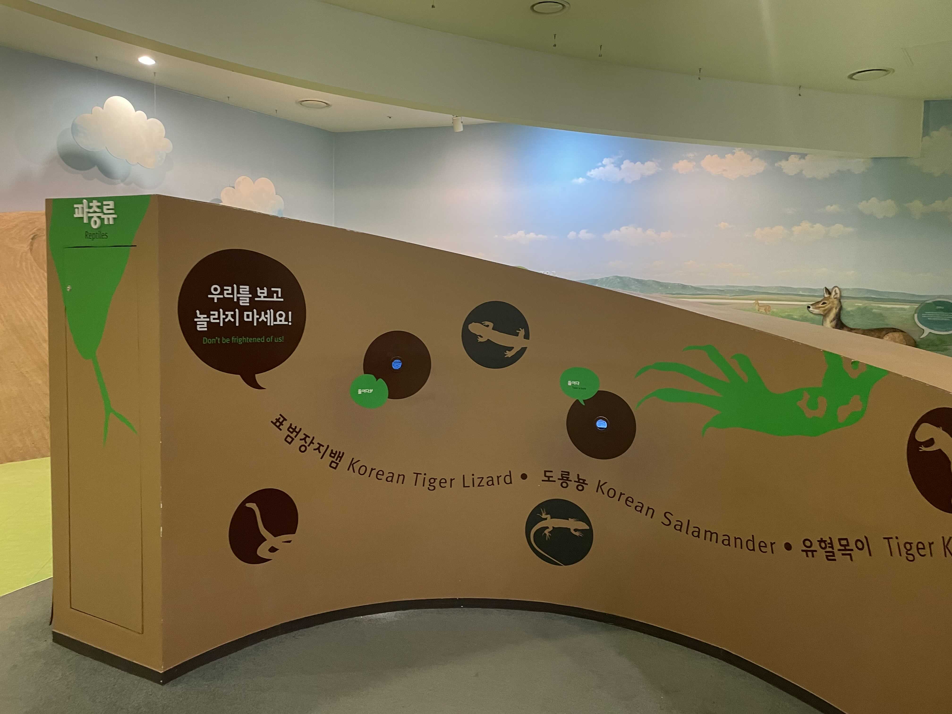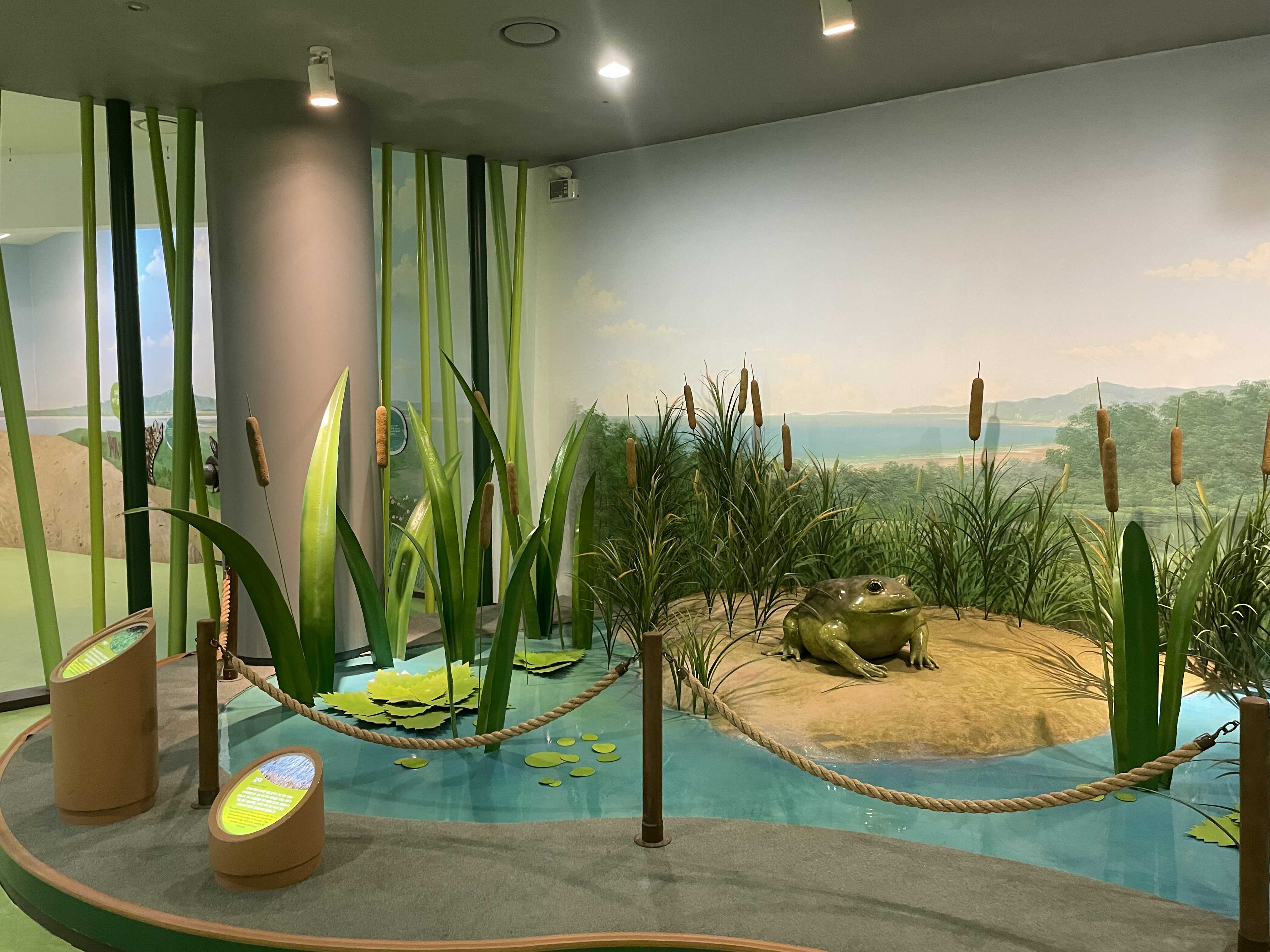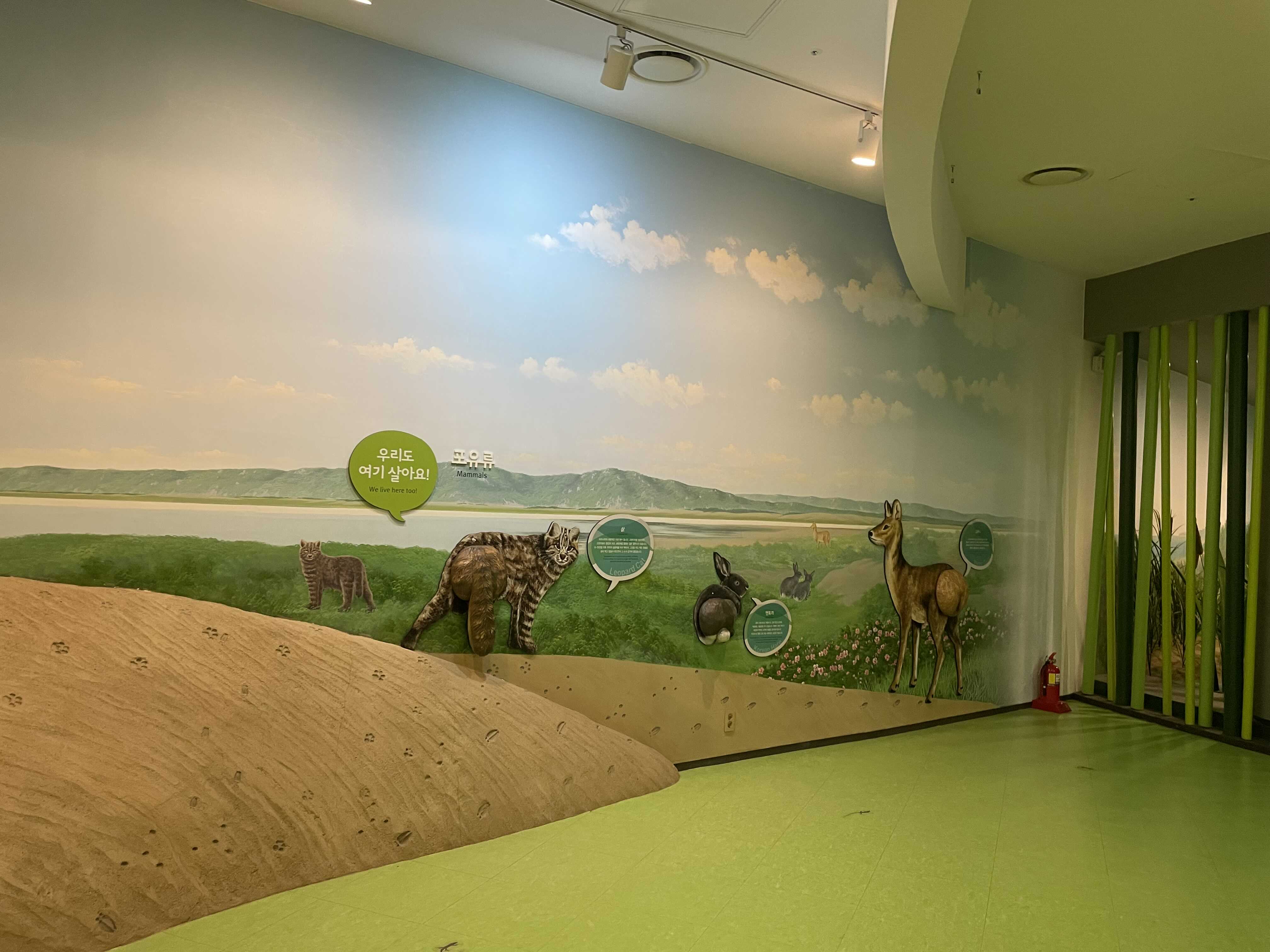 천장에 그려진 두웅습지를 따라 전시를 보라고 하는건지, 아니면 아래로 쭉 내려와 있는 패널을 보고 고개를 들어 천장에 그려진 두웅습지를 보라고 하는 건지 잘 모르겠습니다. 분명한건 고개가 아픕니다.