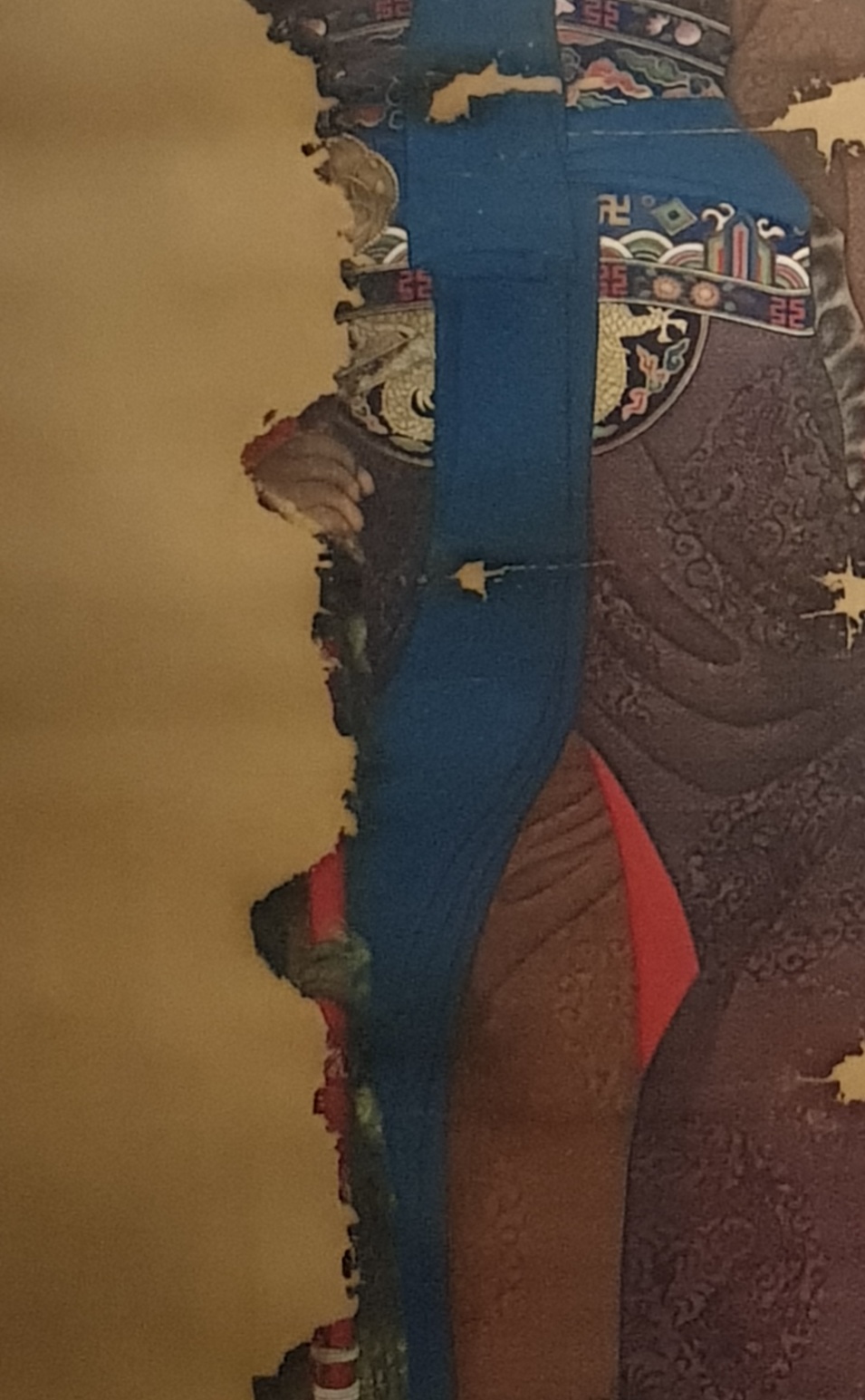 그림 부분만 확대하면 이렇다. 얼굴 중앙을 중심으로 오른쪽 절반이 세로로 날아간 까닭에 저 그림이 표현하고자 하는 복식은 어느 정도 복원이 가능하니