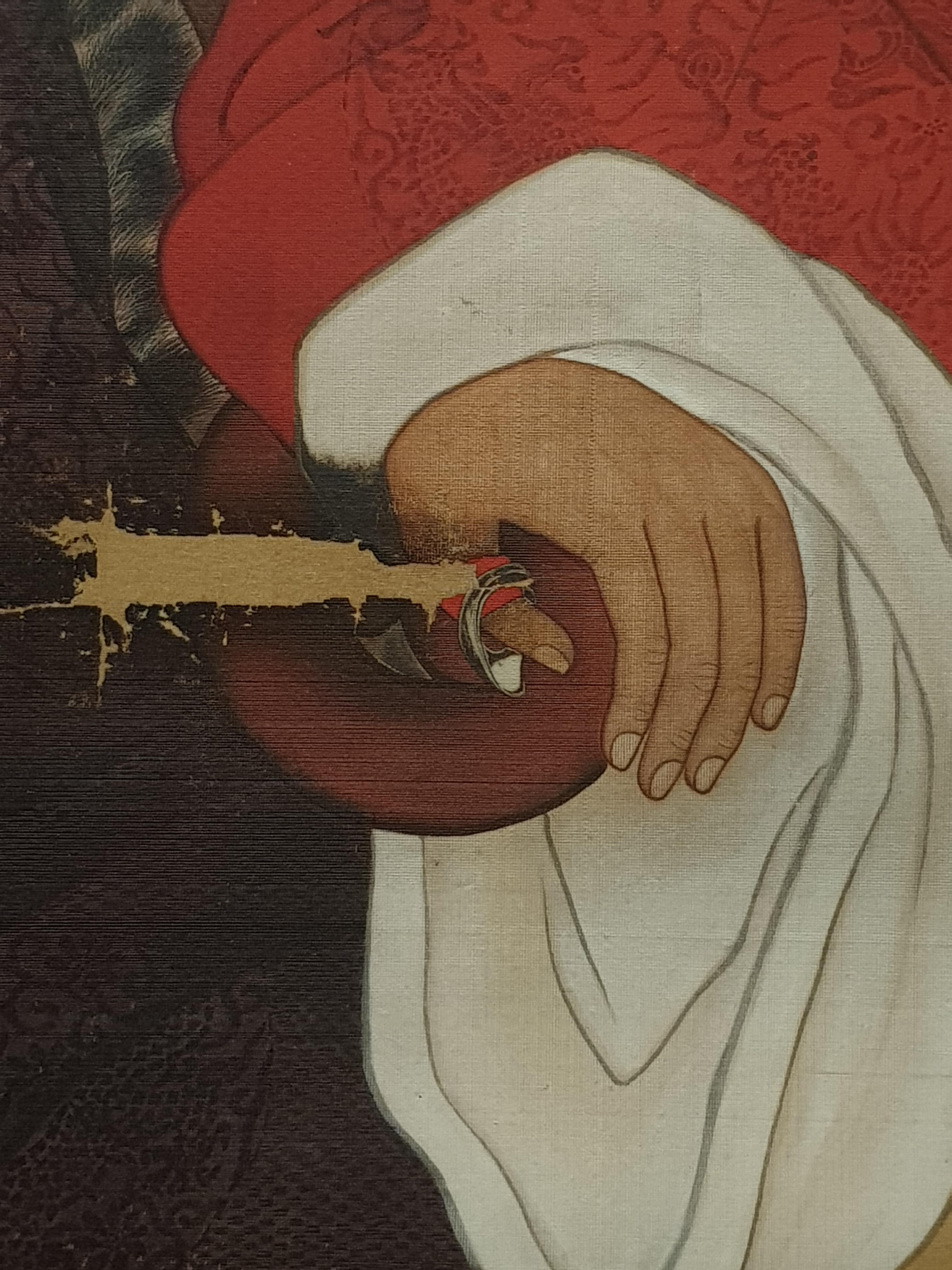 칼이 임금 왼편에 있는데 걸이장치가 안보이는 게 아닌가 한다.