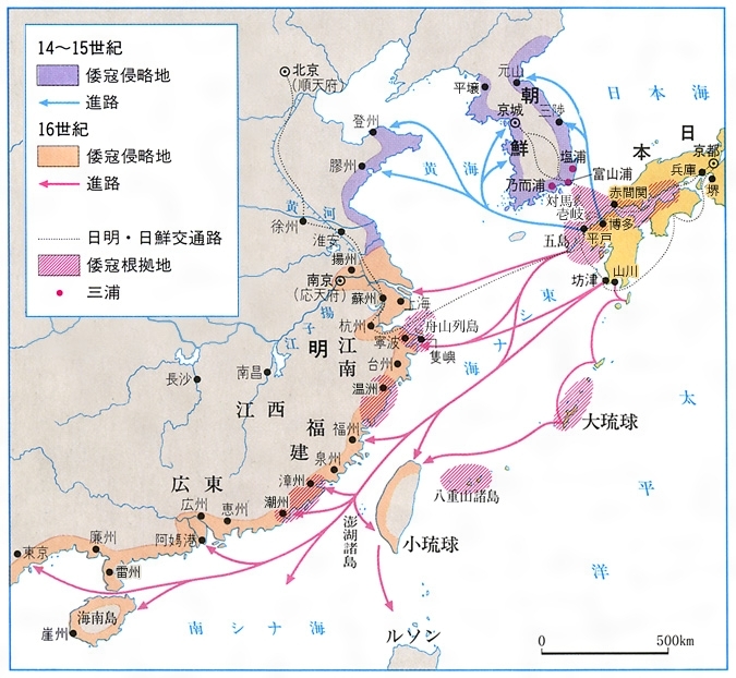 유구를 따라 대만까지 가거나, 아니면 바로 동지나해를 건너 중국 남부지방의 해안을 습격하기 시작하는데, 이 시기가 일본의 전국시대다.
