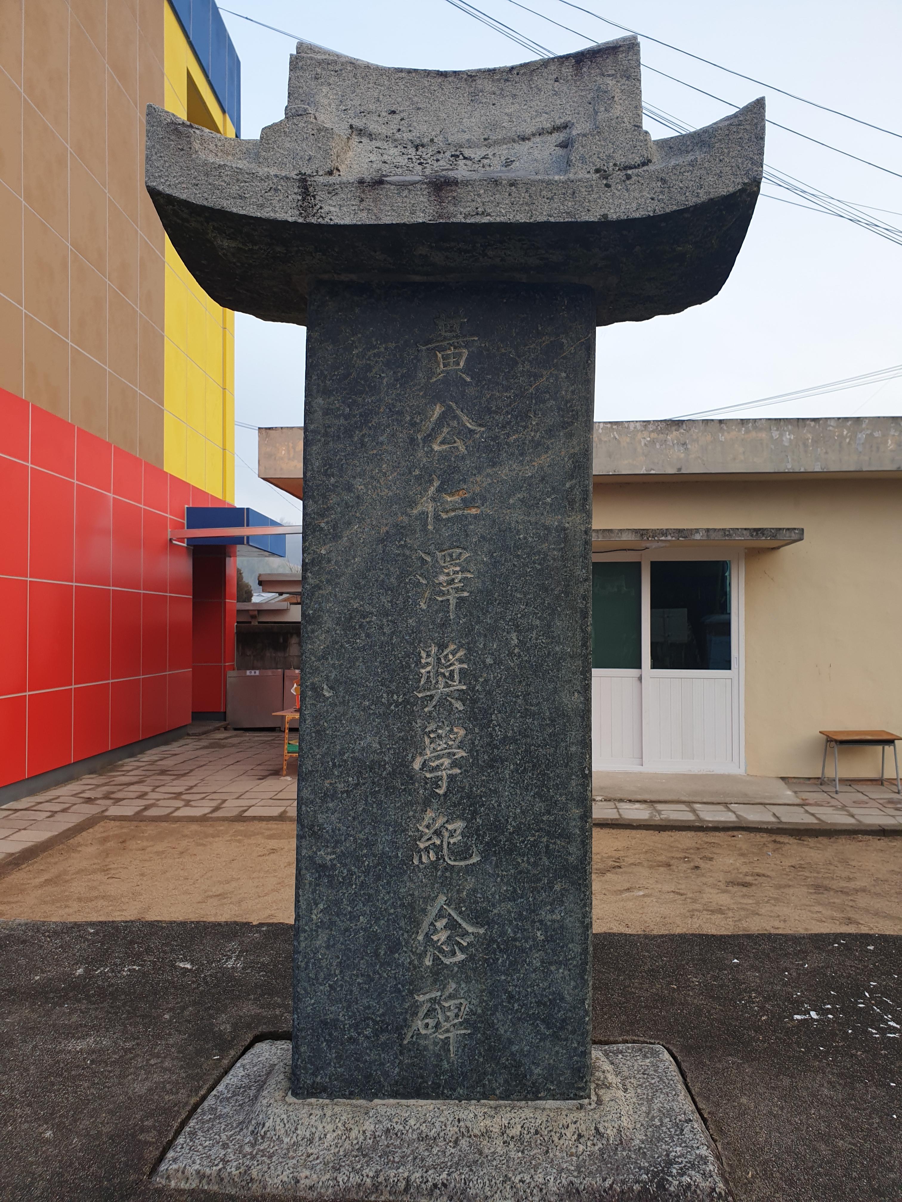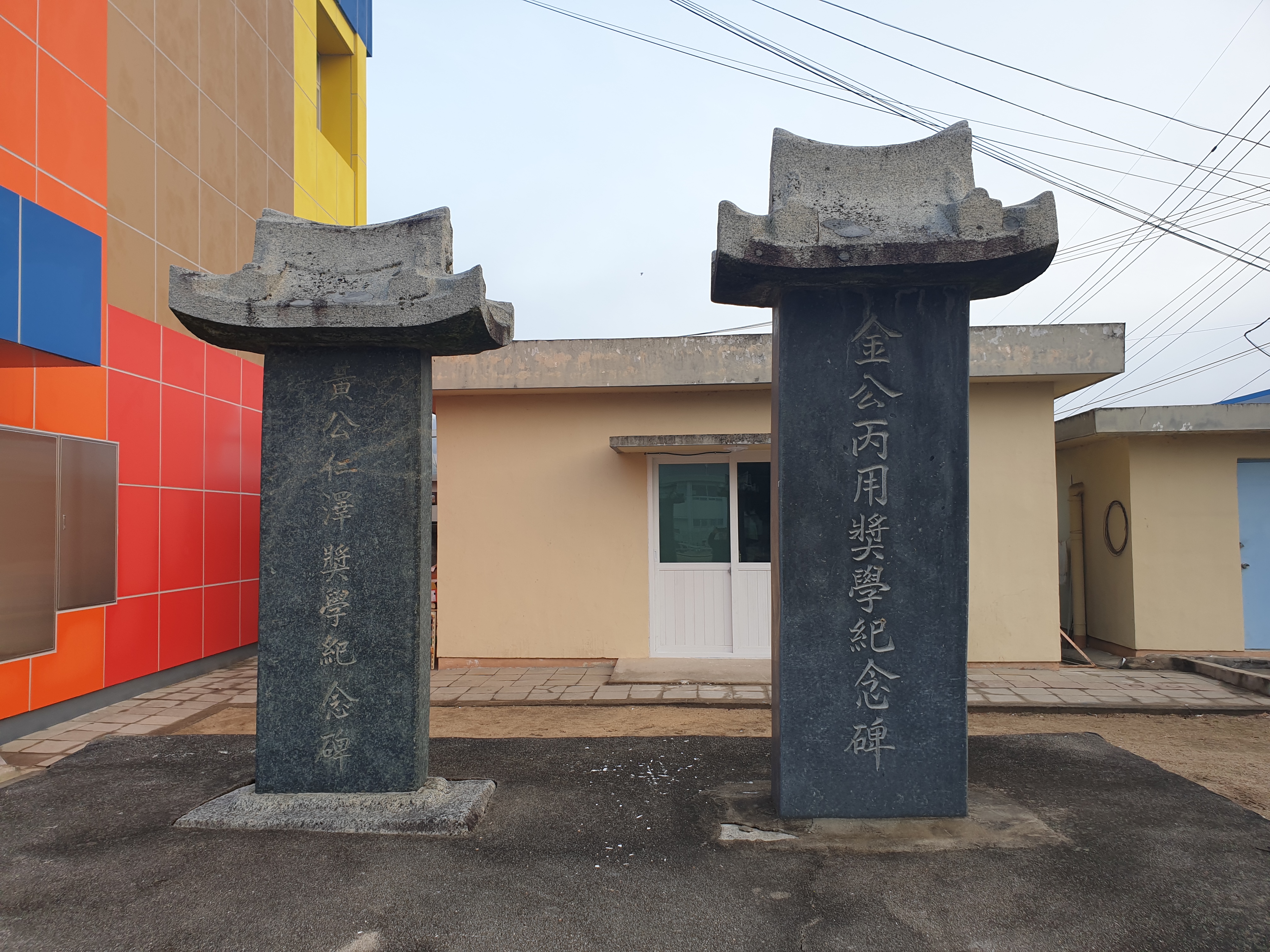 전면 기준으로 바라보아 왼편이 황공 인택 장학 기념비 黃公 仁澤奬學紀念碑요 오른편이 김공 병용 장학 기념비 金公丙用奬學紀念碑라
