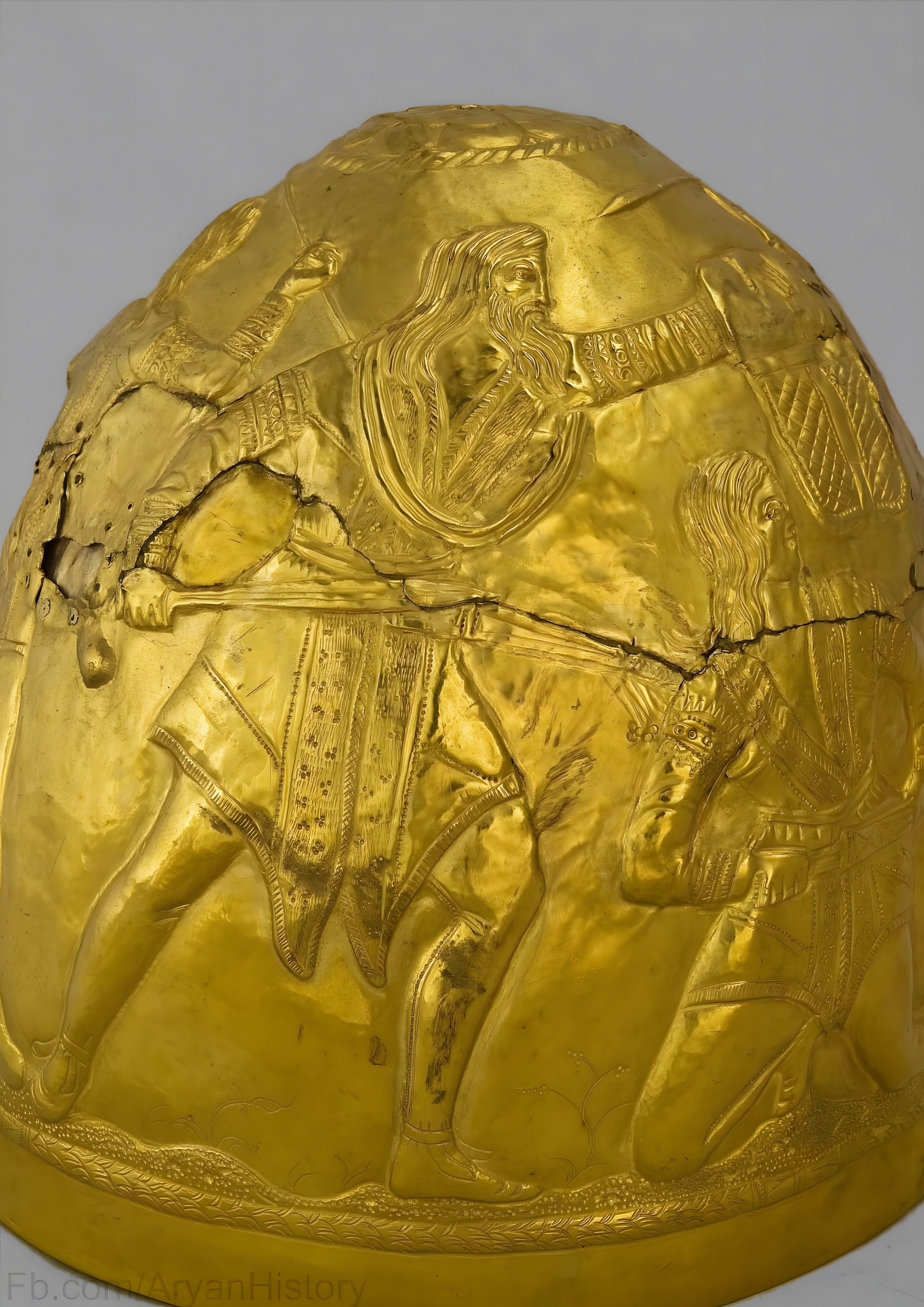 Golden Ritual Artifact: Discovered in 1988 by the Donetsk University expedition led by Alla Moruzhenko near Zrubne, Donetsk. This golden item from the 4th century BC features intricate images of Scythian life, found in the perederieva mound.