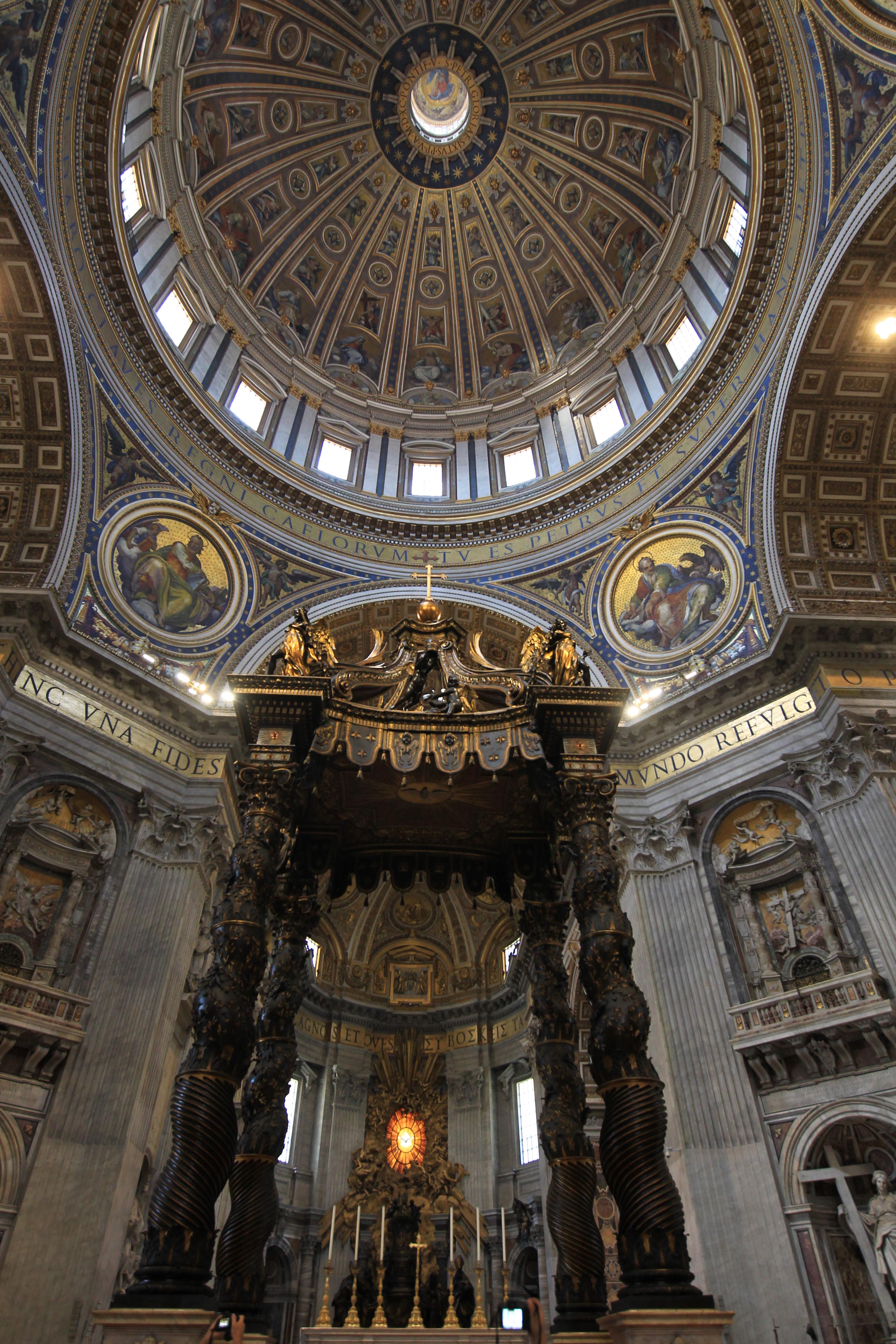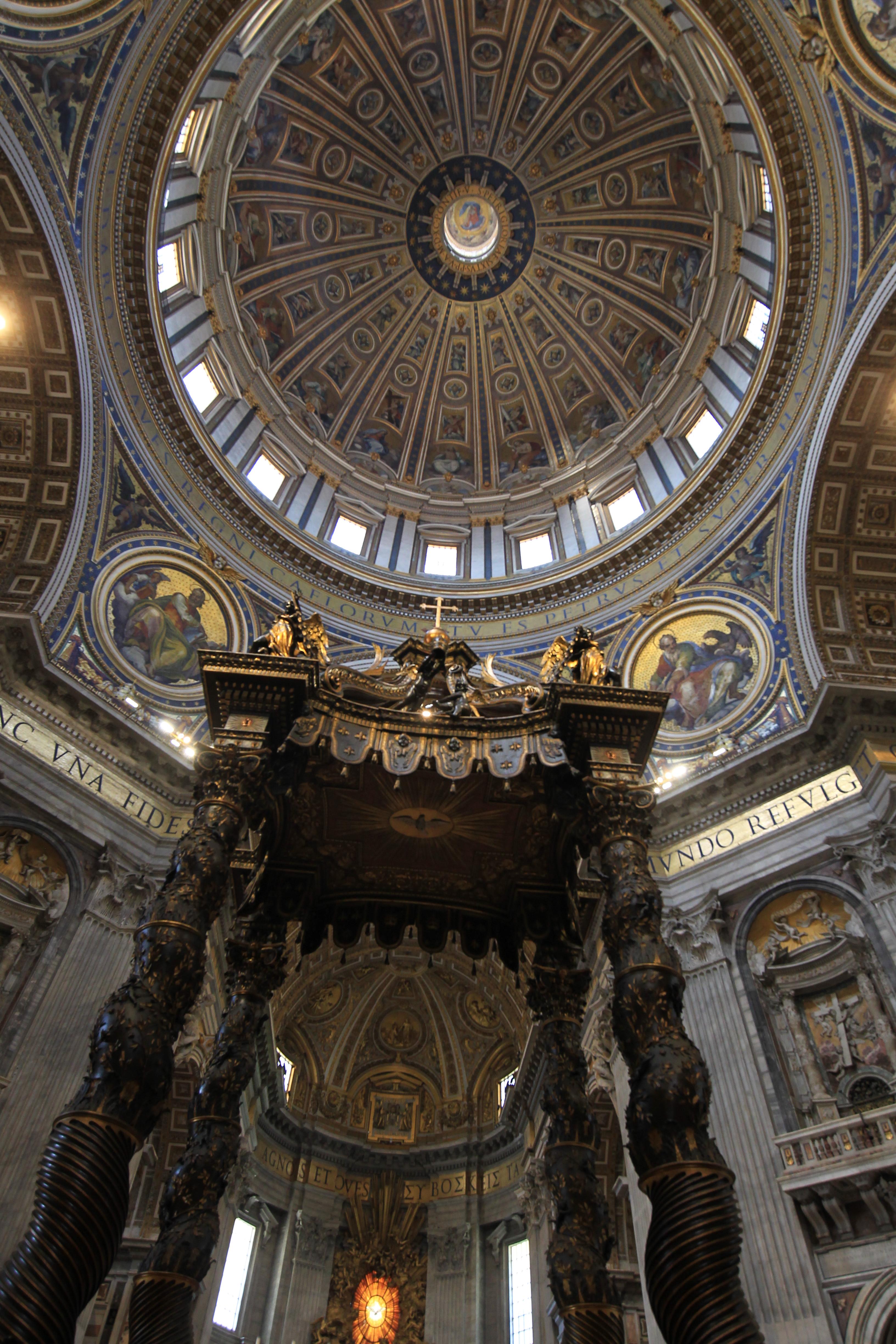 서양 성당 건축에서 돔이 있는 구간 아래가 그 성당 정전과 같은 곳이라, 이 베드로성당에도 돔 아래 바닥 정중앙에는 거대한 발다키노가 있으니, 이것이 그 유명한 베르니니 작품이다.