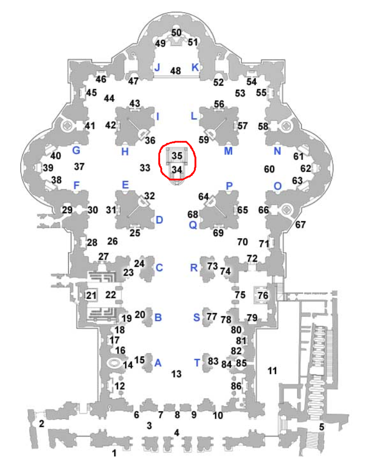 이것이 베드로성당 바닥 평면도라, 붉은 칠을 한 지점이 바로 이 발다키노가 위치하는 지점이라 보다시피 돔 아래 정중앙 바닥을 차지한다.