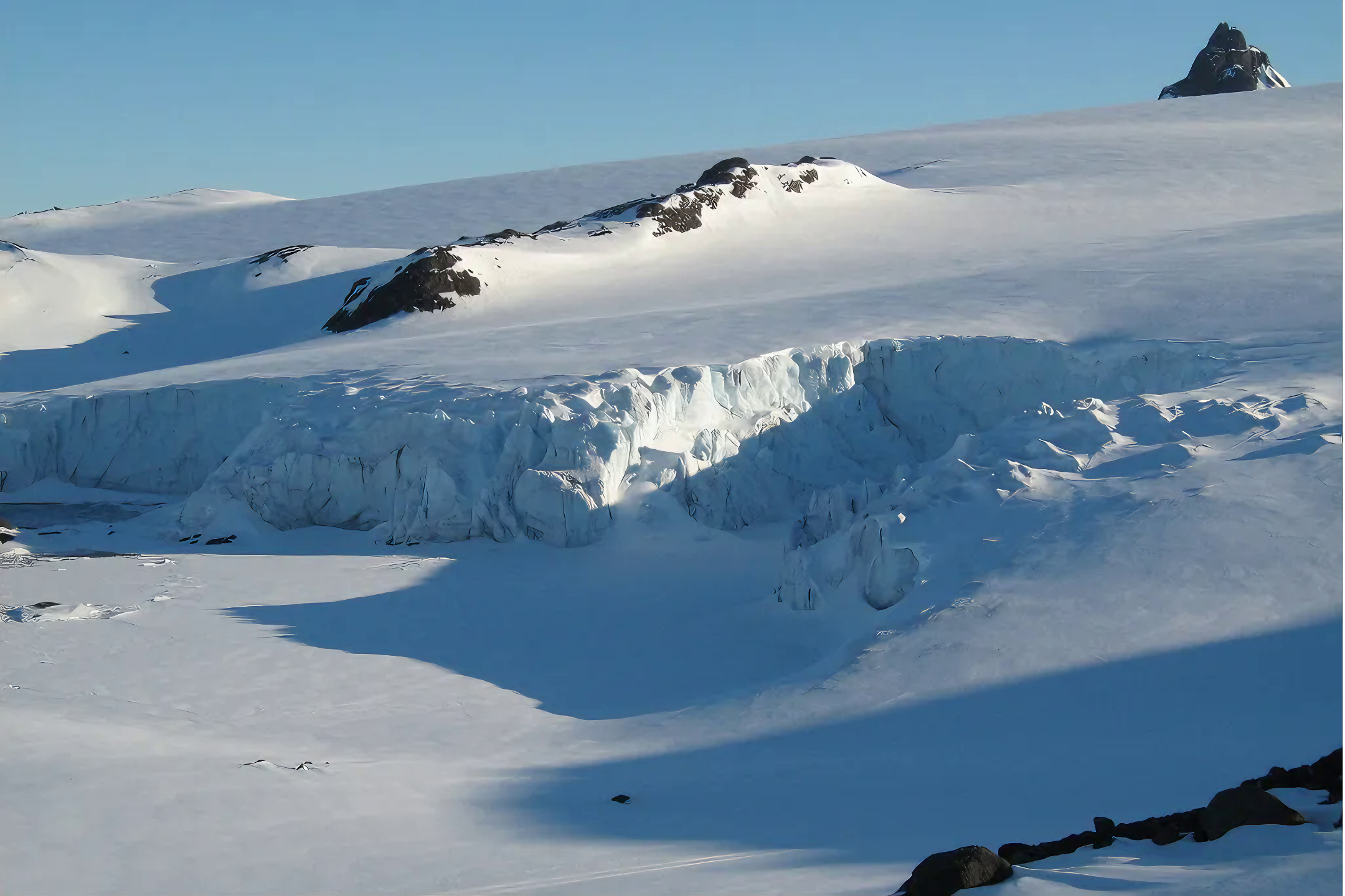 벨과 스토크스는 빙하를 오르며 당시에는 안전하다고 생각한 크레바스 지역을 통과했다.