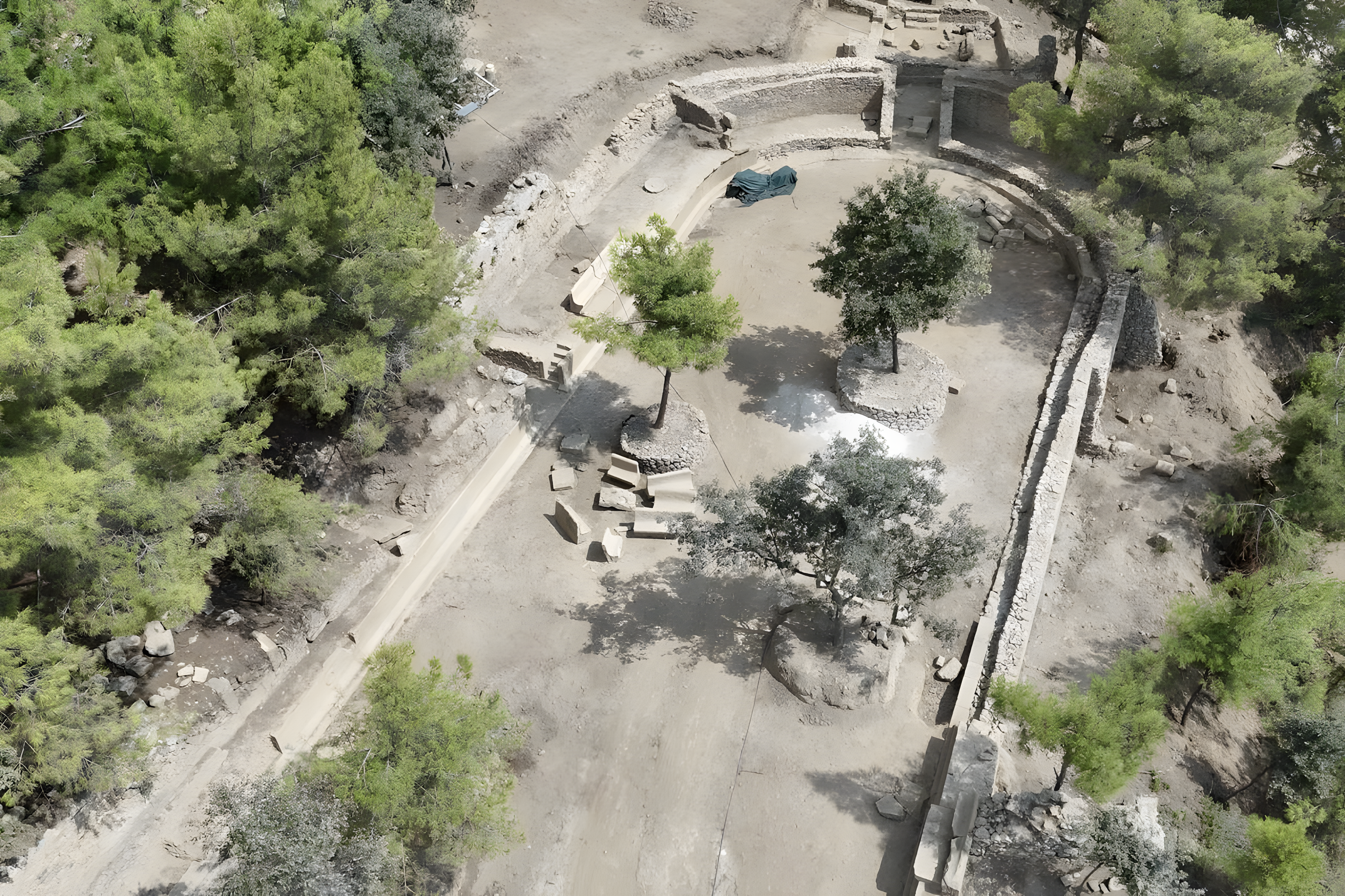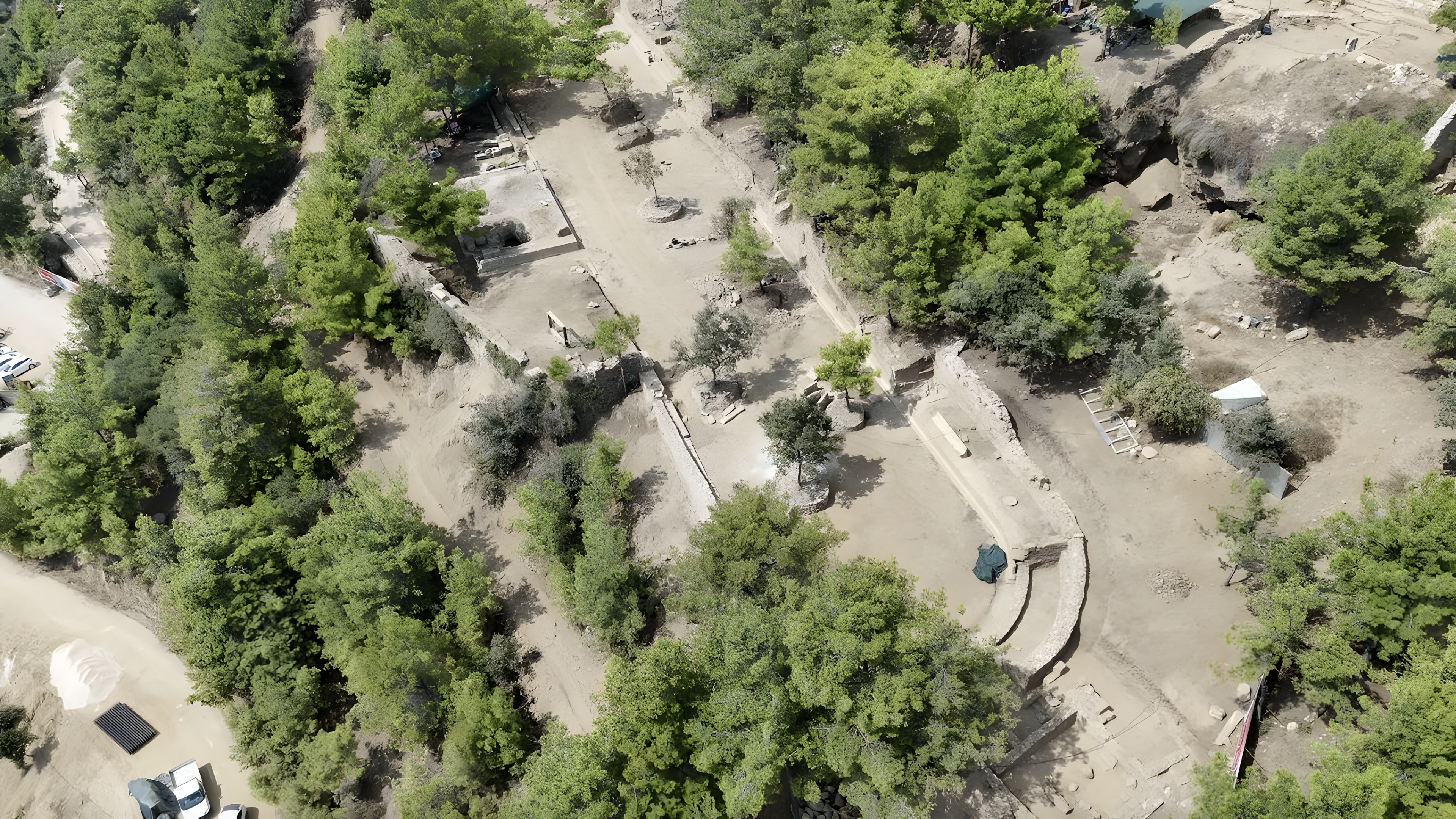 도시 천연 암반에 직접 지은 이 구조물은 수 세기 동안 부분적으로 가려져 있었고, 현재 발굴 작업이 시작되기 전까지는 좌석 열 일부만 드러났다.