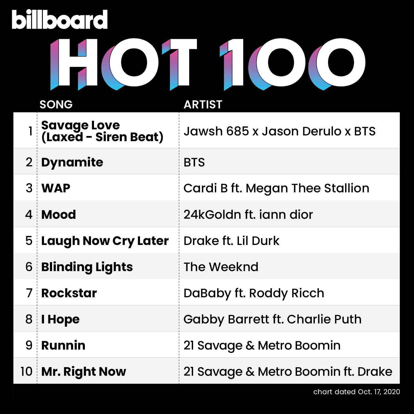저 친구들이 앨범차트에서는 언젠가부터 1등을 씹어먹었지만, 싸이가 강남스타일로 계속 시도하다가 7주 연속인가 2등으로 턱걸이한 빌보도 싱글차트 핫100에서도 Dynamite로 대망의 1등을 먹더니만, 이번에는 그네들이 참여한 새비지 러브 Savage Love 리믹스 버전이 1등을 했단다. 이번 차트에서 더구나 2등은 얼마전 발표한 다이너마이트라니, 그야말로 빌보드 차트를 씹어먹은 셈이다.
