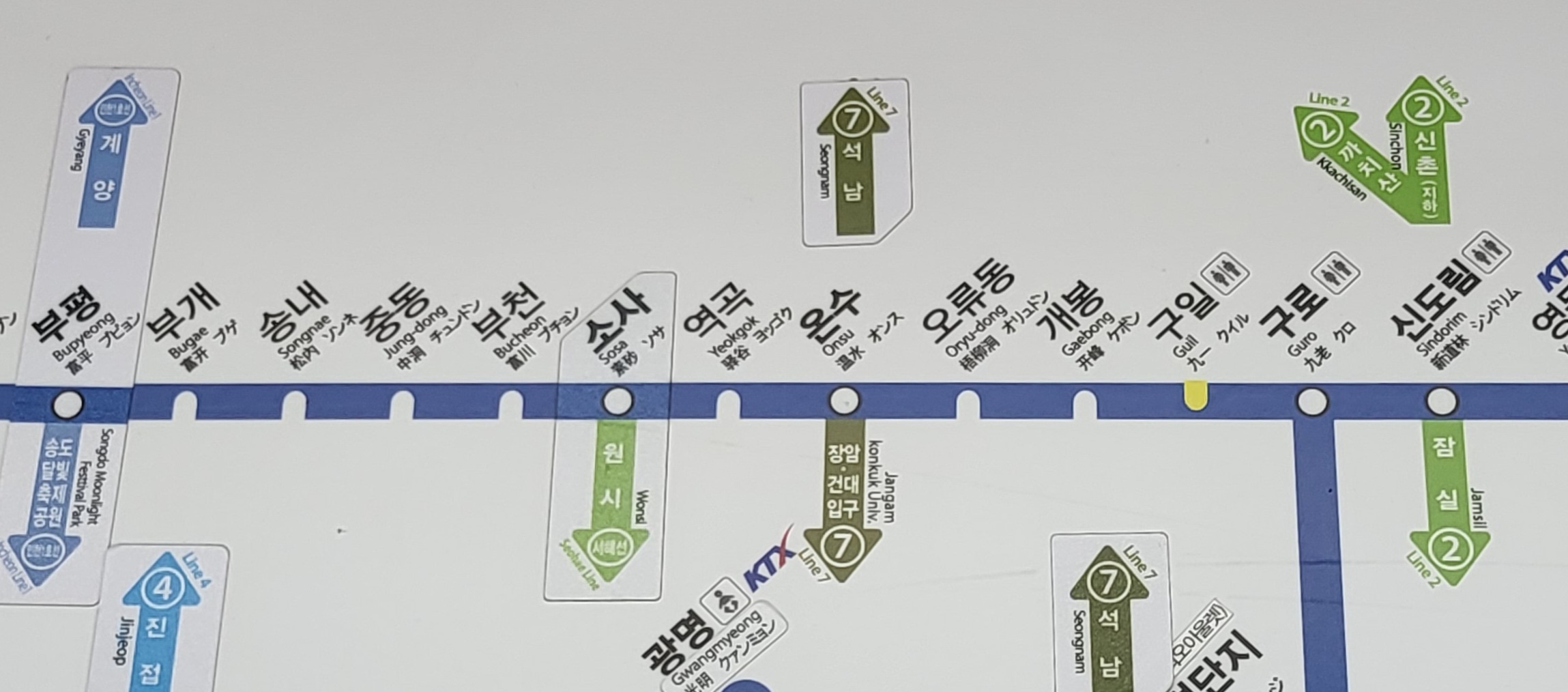 그 시절 저 구간 노선을 보면 역간 거리를 킬로미터 단위로 적어놓았으니 딴 건 다 까먹었지만 부천-역곡 구간이 3.4킬로였다는 기억만은 또렷하다.