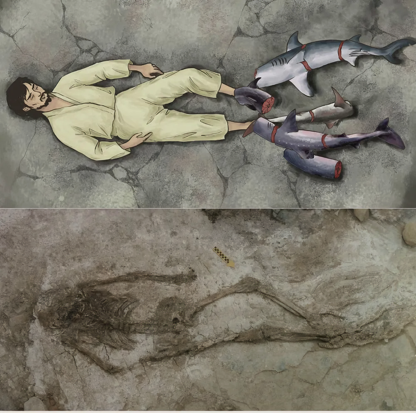임당유적에서 순장자 발밑에 묻어둔 상어를 순장자와 함께 복원한 모습. 임당 고분에서 다양한 제사 음식 가운데 특히 많은 양의 상어뼈가 눈에 띈다. 연구자들은 상어고기를 토막내어 소금에 절인 돔배기를 떠올린다. 경상도 내륙지방 사람들이 즐겨 먹는 ‘돔배기’가 2000~1500년전 사람들도 즐겼을 것이다. |국립대구박물관 복원