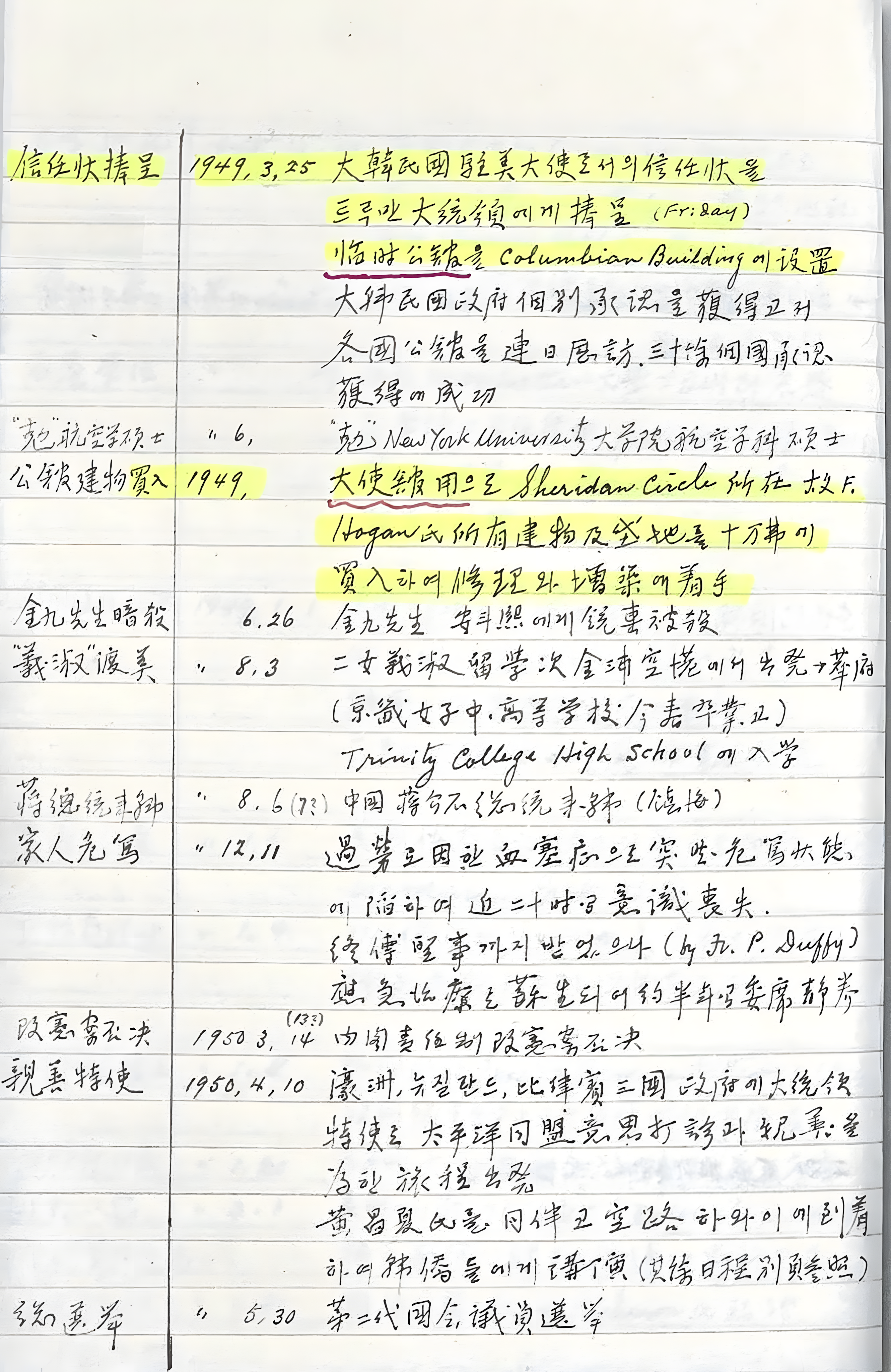 이어 임시정부시절 주미외교위원부 사무실이 있던 콜럼비안빌딩에 방 두 개를 임대해 '임시공관'을 개설한다.(훗날 장면이 이를 친필로 기록한 비망록 노트에도 분명히 '임시공관'이라 기재해 그 의미를 분명히 했다.) *사진 참조