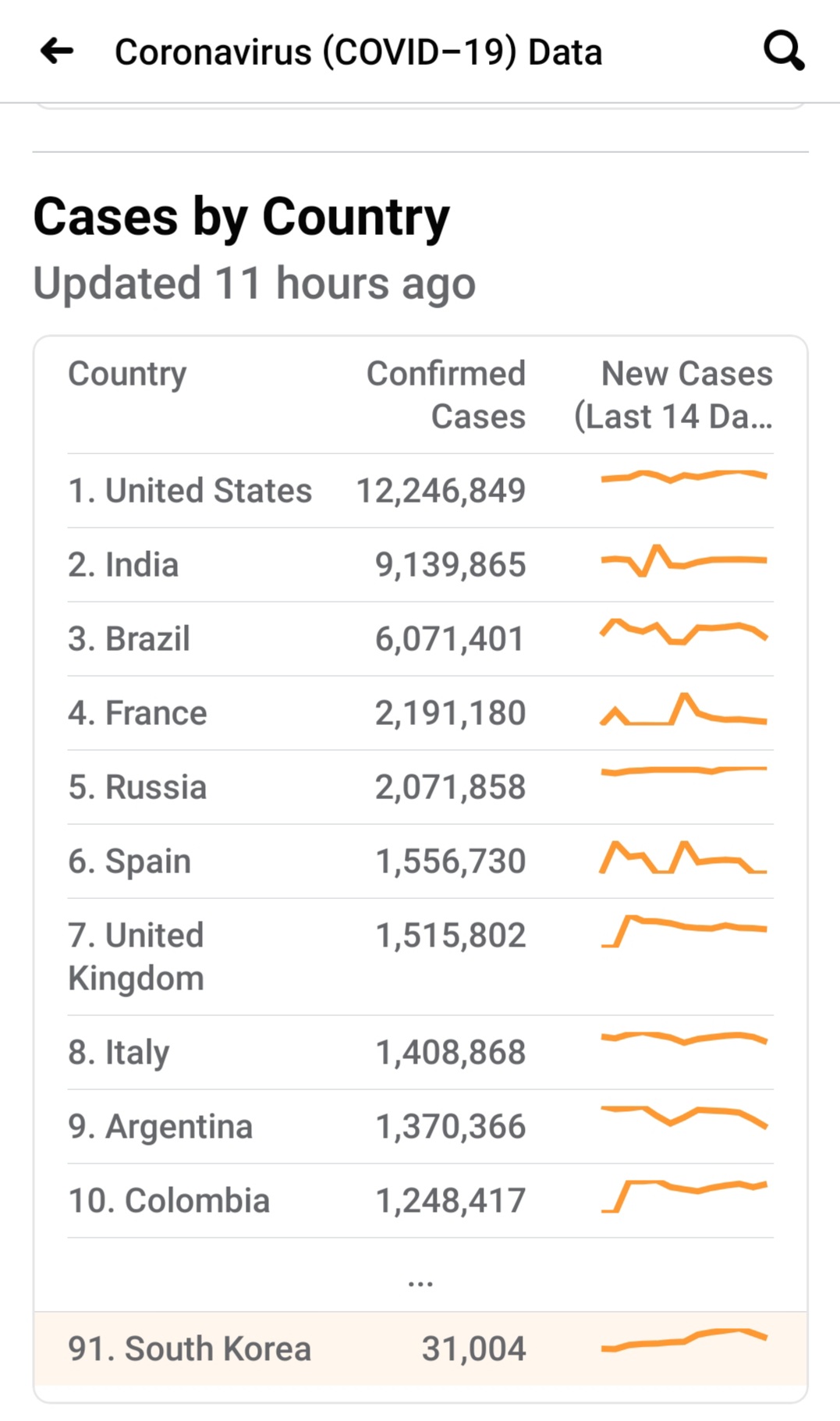 현재 코비드19 상황이 이렇댄다. 감염규모가 미국과 인도가 1천만명대를 오락가락하며, 브라질이 600만명이라 하며, 200만명에서 150만명을 헤아리는 라틴 3국 프랑스 스페인 이태리는 검사에서 걸린 게 저 정도요 실상은 집단면역 체계를 향해 달려가지 않나 할 정도다.