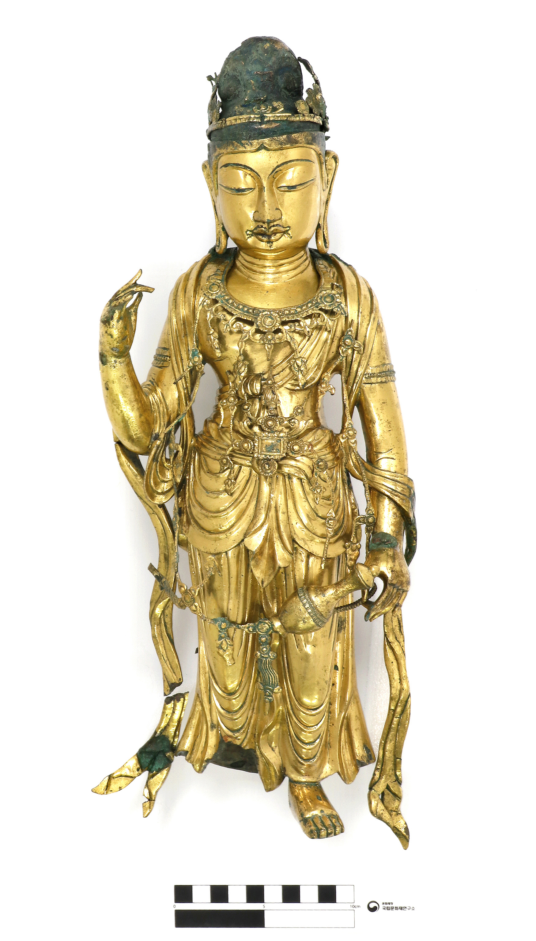 The 9th century Unified Silla-era gilt-bronze Bodhisattva statue (hereinafter referred to as the statue) from Seollimwon Temple Site is the largest (38.7cm in height and 4.0kg in weight - the statue, 14.0cm in hight and 3.7kg in weight - the pedestal) among Bodhisattva statues whose excavation sites were exactly known, and the pedestal and halo which were carved splendidly remain intact, which made the statue draw great attention. CHCSC devoted 5 years until the present to restoration for its original shape in gold color and determined its manufacturing technique and period when it was manufactured.