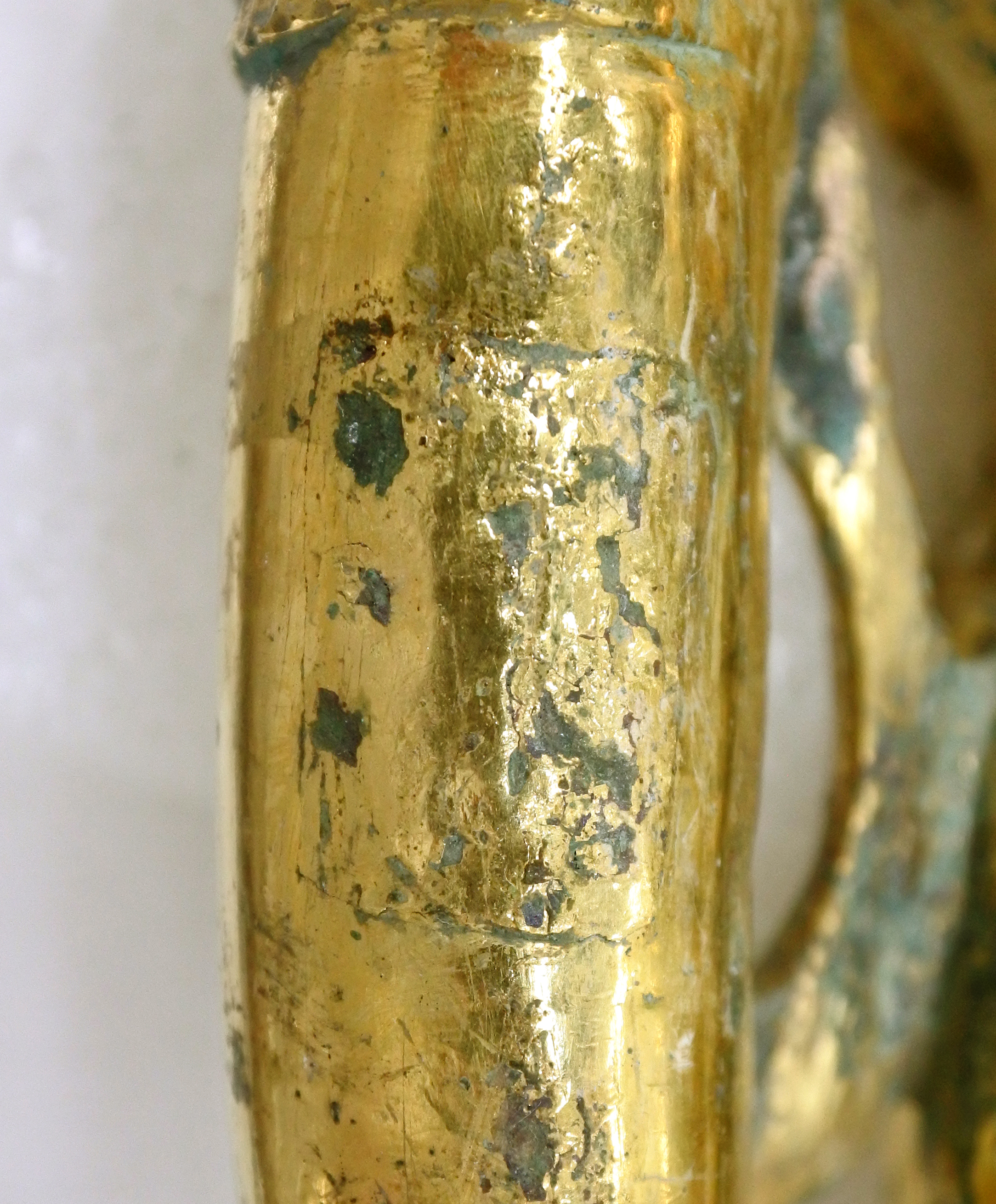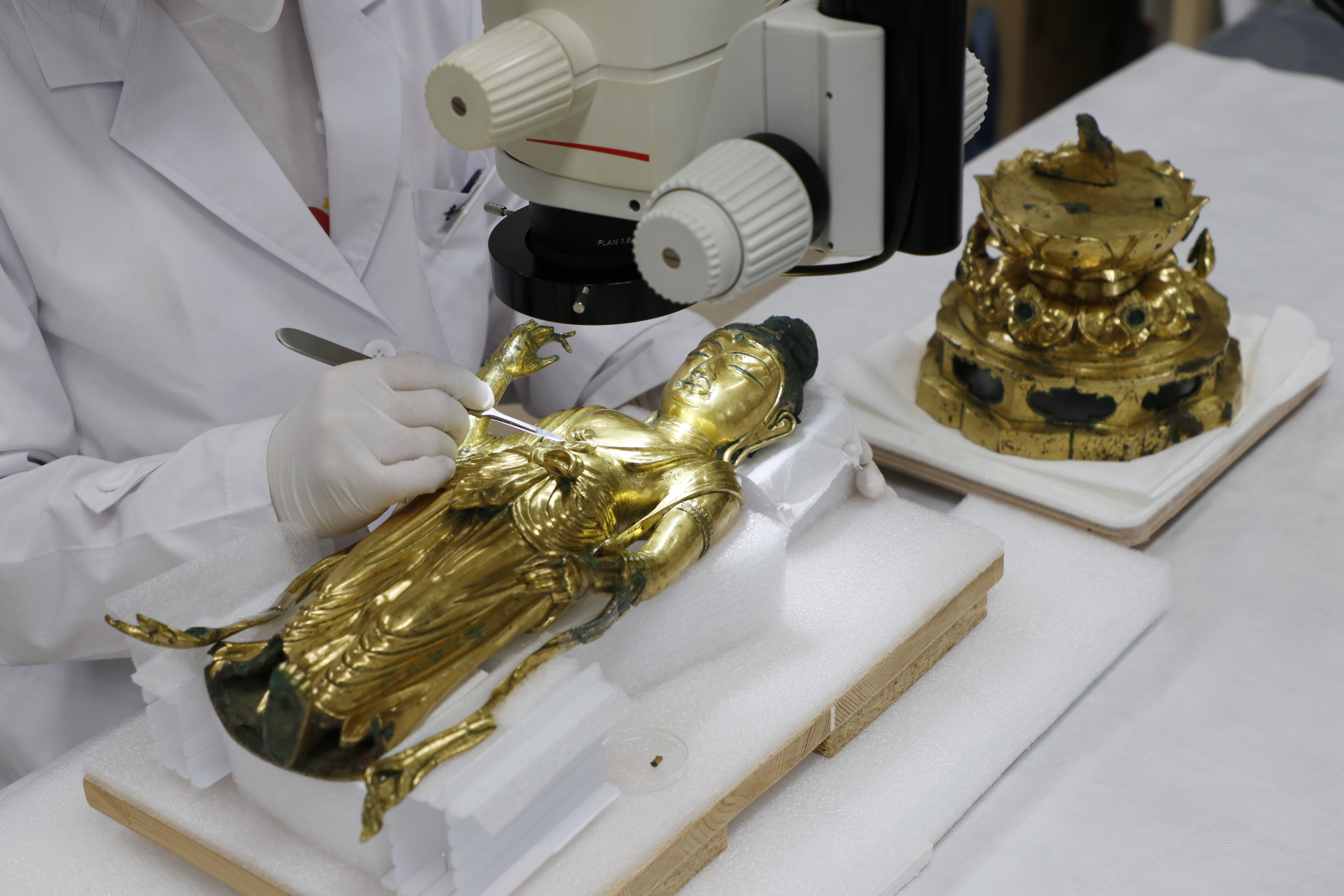 As a result of research, the gilded layer was unstable as its form was manufactured with copper alloy and gilded with gold, and greenish bronze corrosion was situated on it. To restore its original color of gilded layers, removal of bronze corrosion was required but it was firmly attached to the gilded layer. Therefore, the corrosion layer was removed one by one with meticulous care while it was closely observed at high magnification under a microscope, which was such a fastidious and demanding process of conservation work. The corrosion removal was the most significant process for restoring the shape and value of the statue, taking much time over 4 years.