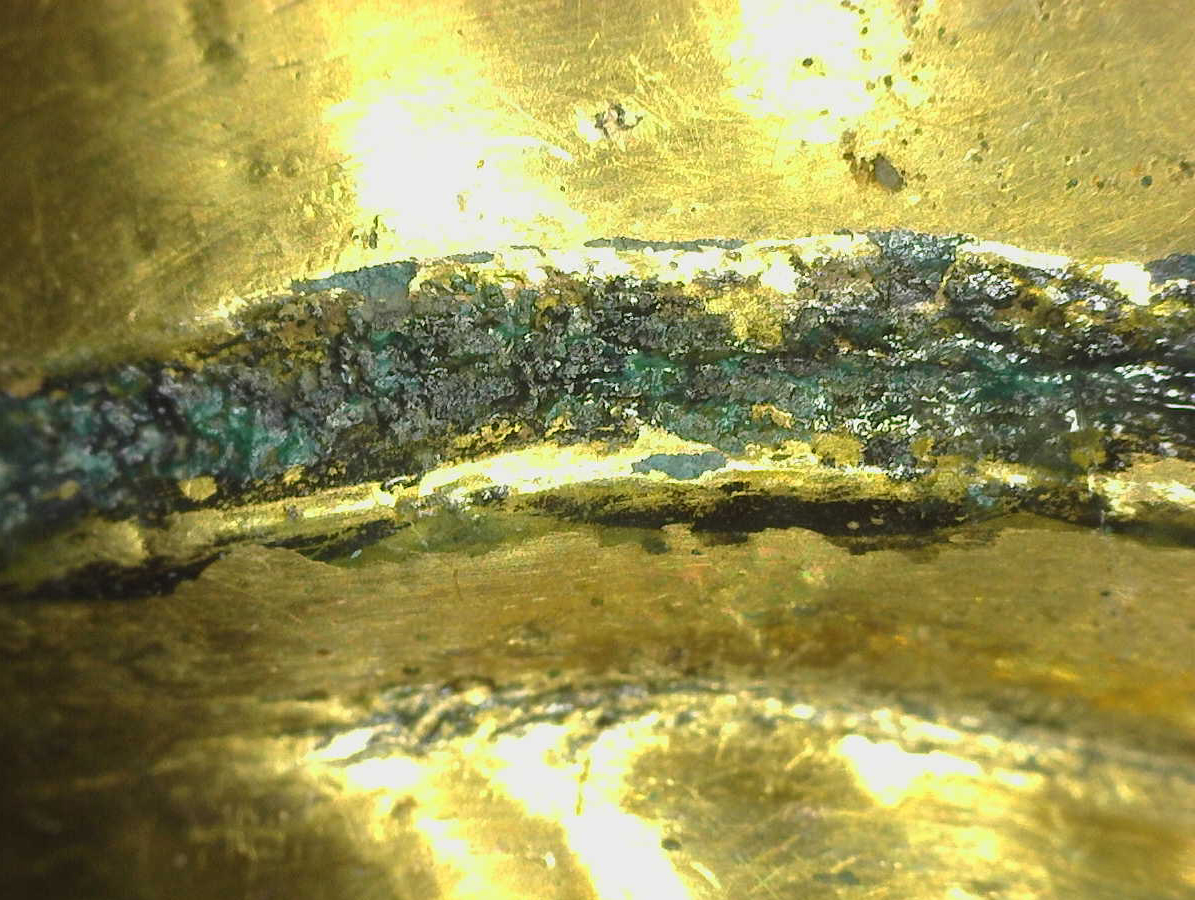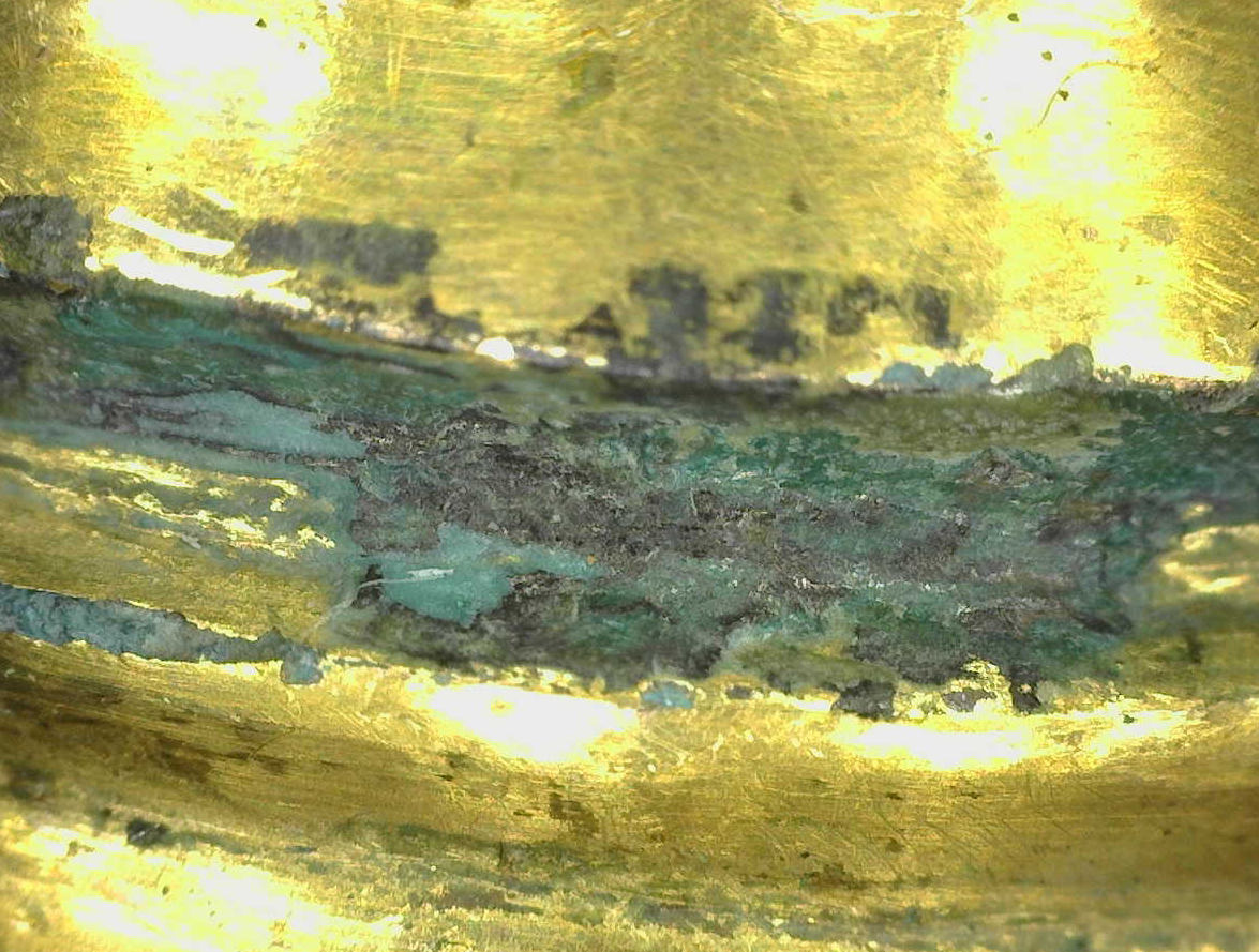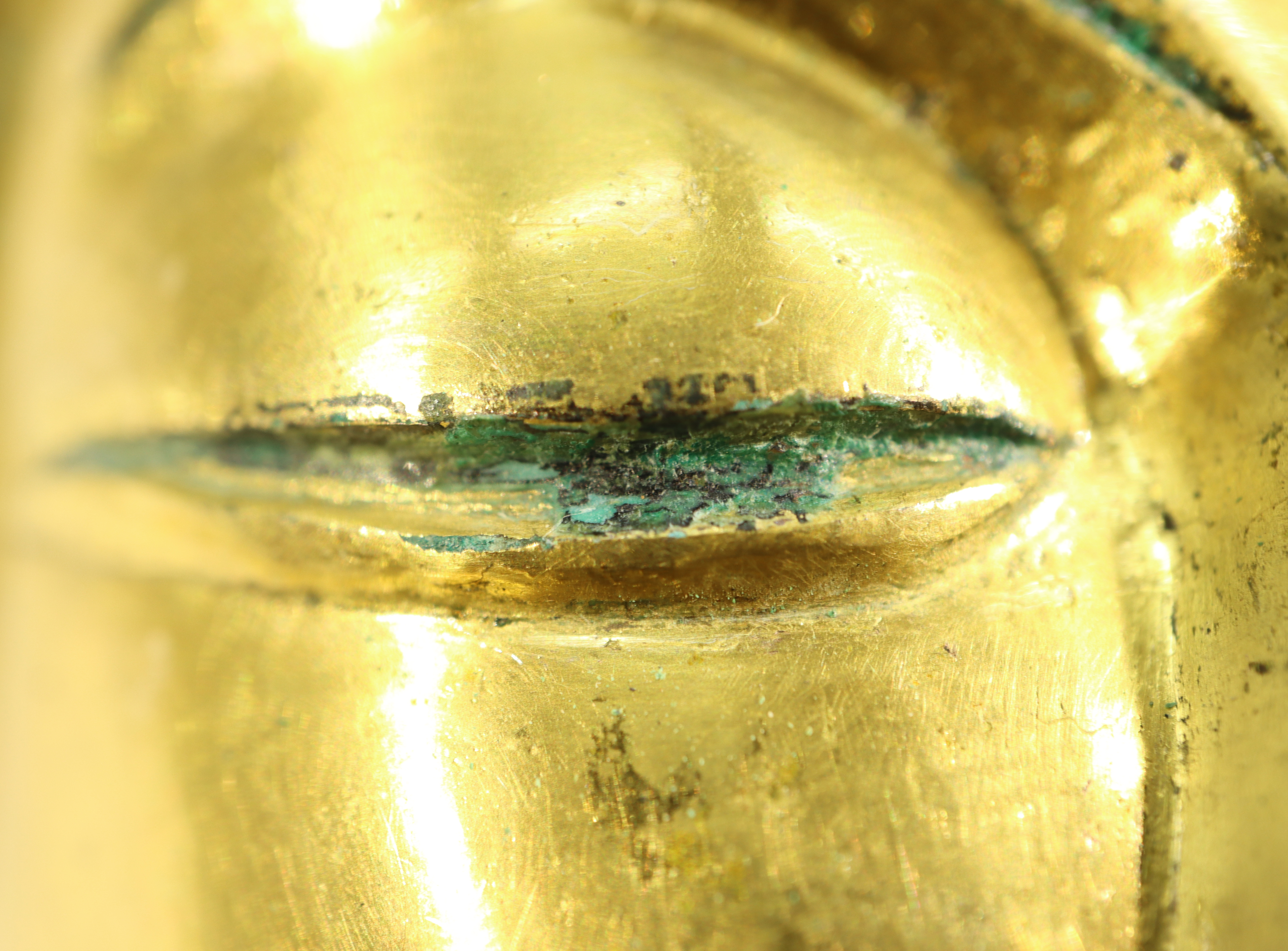 Such a process led to revealing gilded layers clearly and moreover, delicately drawn on ink lines the gilded layer could be found as well. Areas with ink lines were identified at 4 points from eyebrows, eyes (shapes, pupils), mustache and the rim with an elephant-eye motif by wwwwork on the pedestal. In particular, its pupils drawn in ink could be found beneath bronze corrosion by microscopy at high magnification.