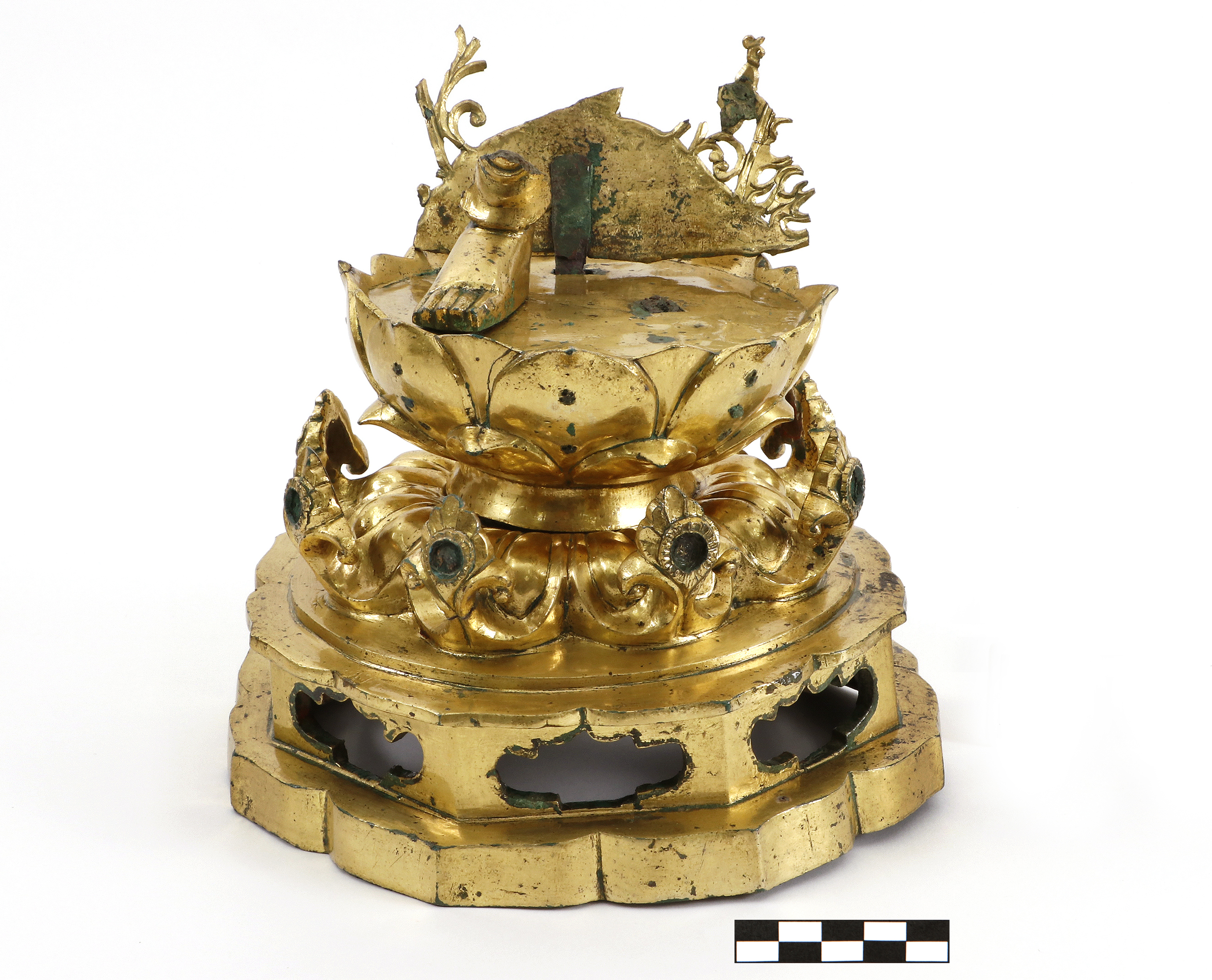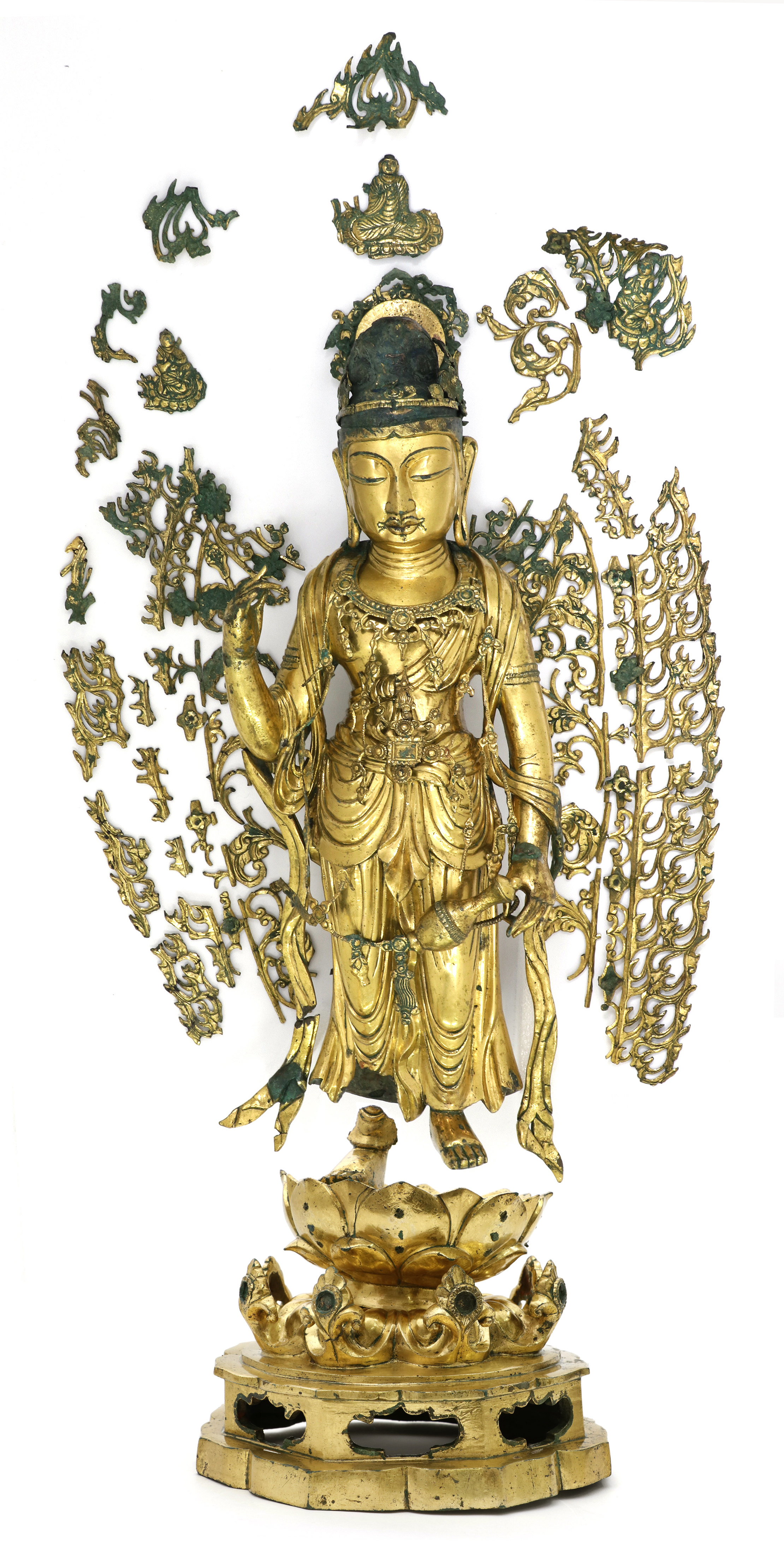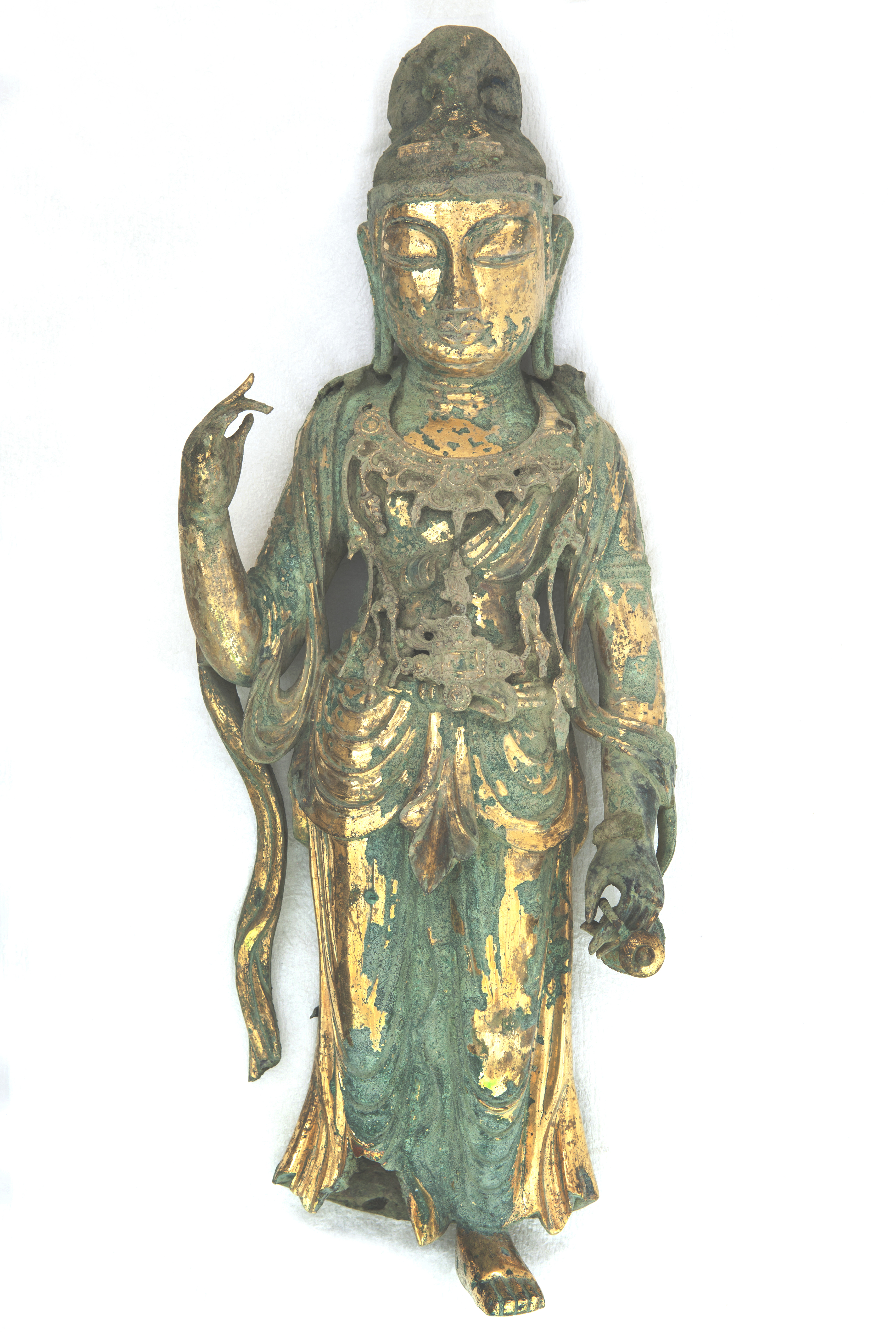 From the research on the manufacturing process, it indicates that the statue was cast as the single-piece object with copper alloy, and marks of molding holes were found at the back of both arms from the result of X-ray and those holes are presumed to have been plugged up with gold plates and gilded after a casting was completed.