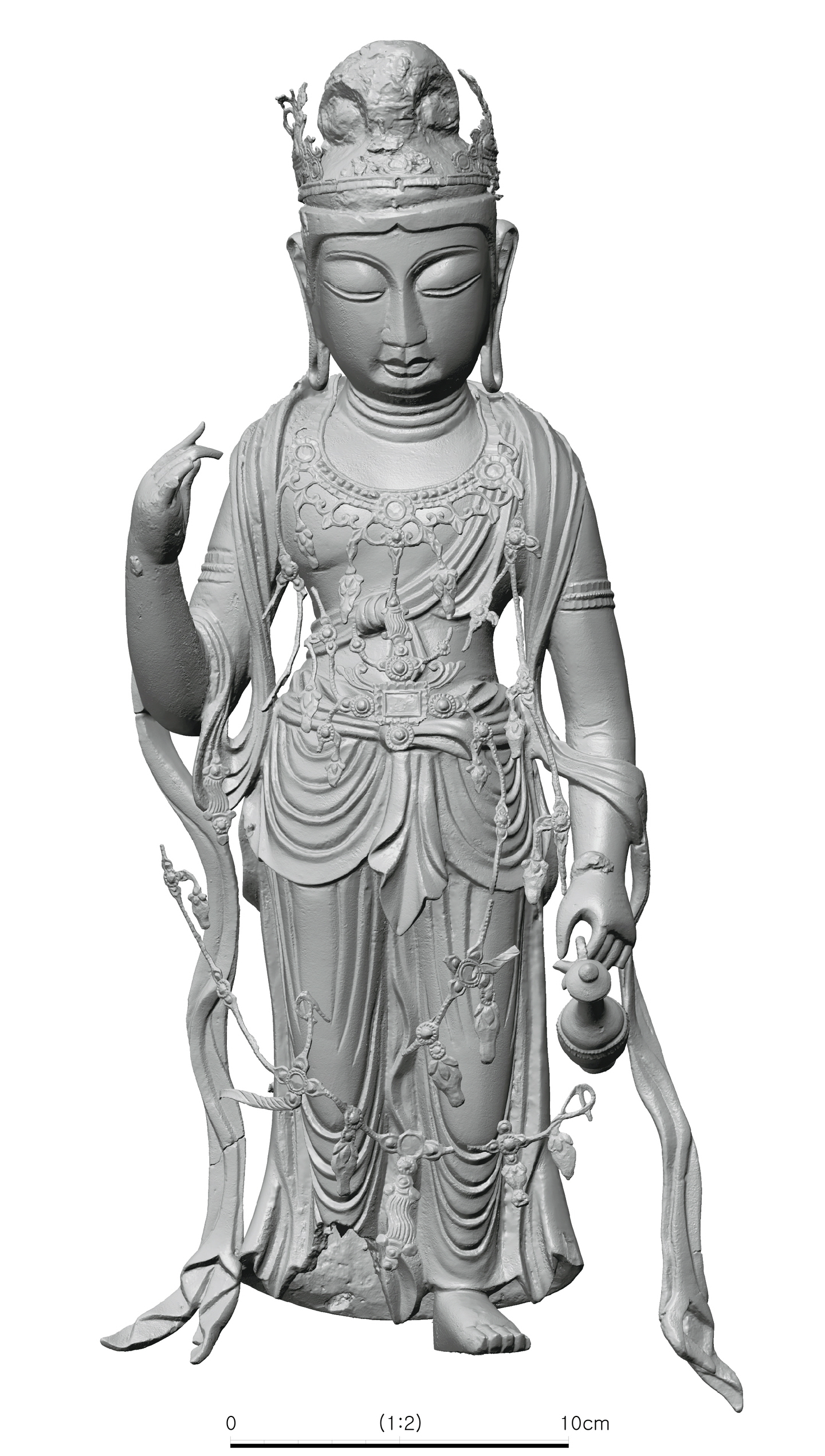 The CHCSC made its effort to restore the shape of the statue with Hanbit Institute of Cultural Properties through 3D scans and image restoration and could succeed in restoring for the original shape of the statue in the end. In the case of decorations such as Bogwan, Yeongrak, Jeongbyeong besides the statue, halo and pedestal, those decorations were identified to have been separately manufactured and then joined to the statue respectively. Some shapes of them were transformed during the excavation, which made it difficult to join them for restoration.