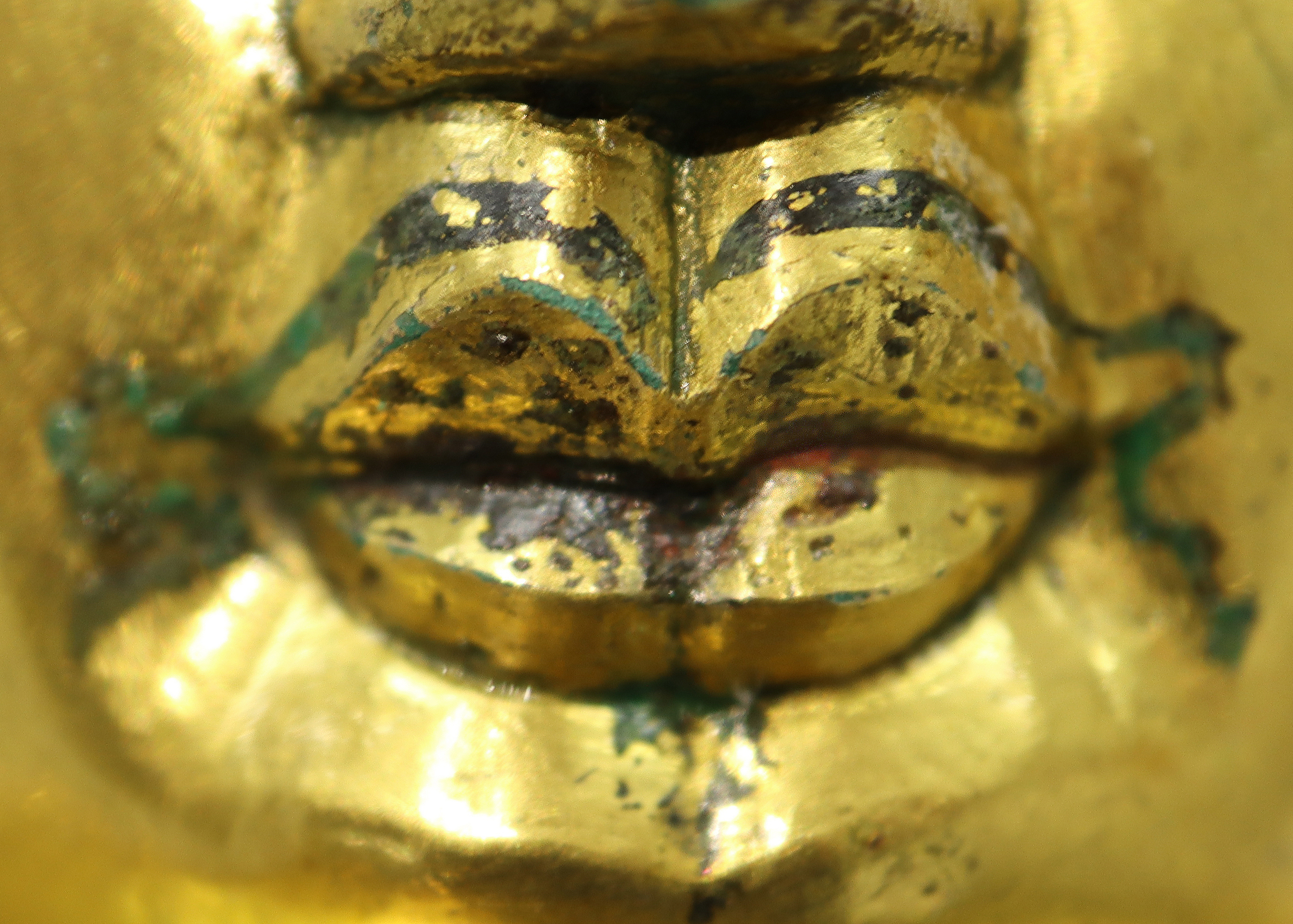 Such a process led to revealing gilded layers clearly and moreover, delicately drawn on ink lines the gilded layer could be found as well. Areas with ink lines were identified at 4 points from eyebrows, eyes (shapes, pupils), mustache and the rim with an elephant-eye motif by wwwwork on the pedestal. In particular, its pupils drawn in ink could be found beneath bronze corrosion by microscopy at high magnification.