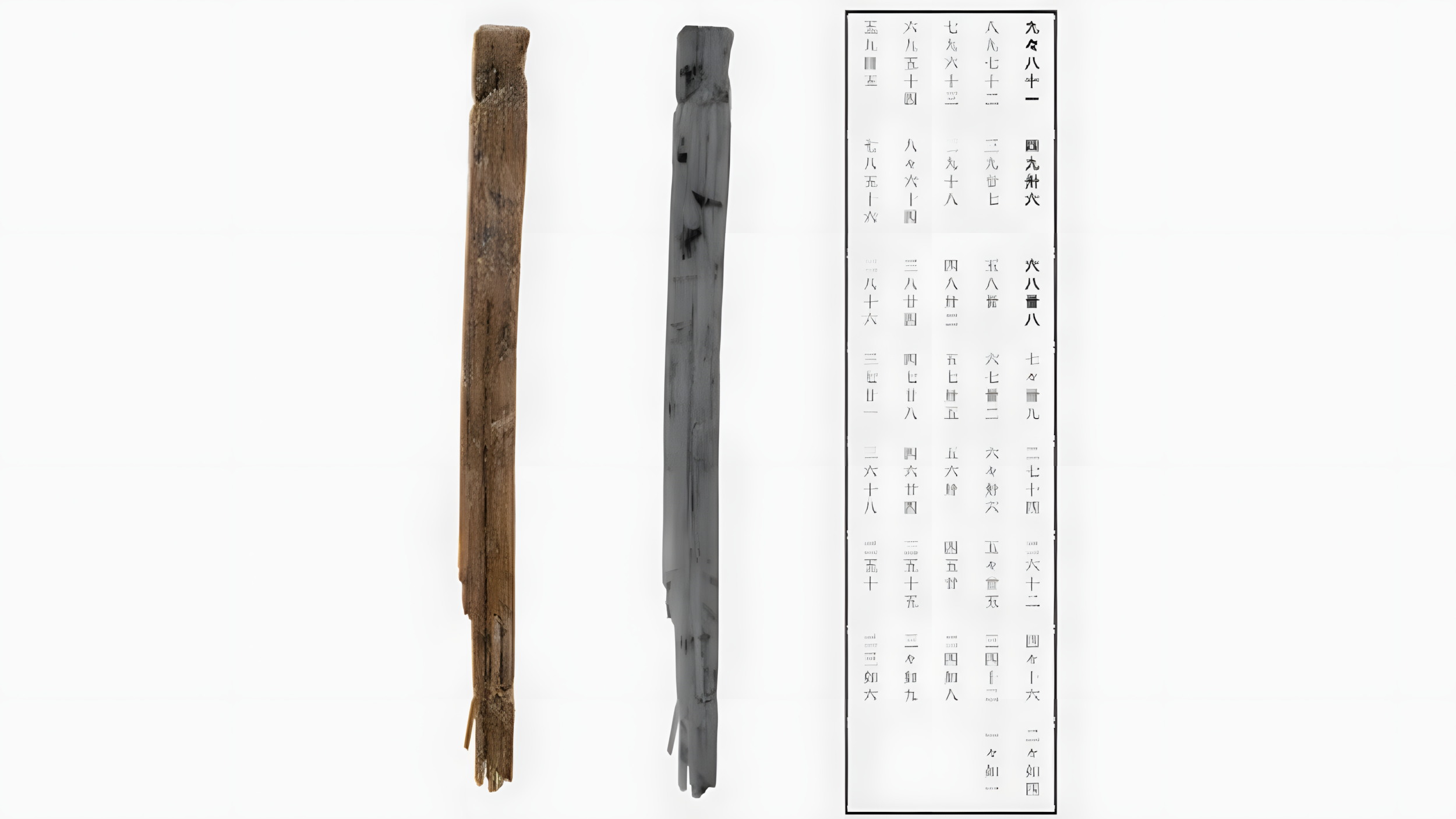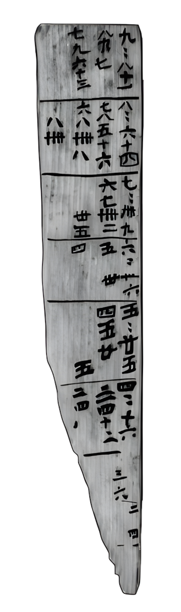 가로 16.2cm, 세로 1.2cm 크기인 이 나무 조각은 7세기 말에서 8세기 초 사이에 제작된 것으로 추정되는 더 큰 구구단표 일부다.