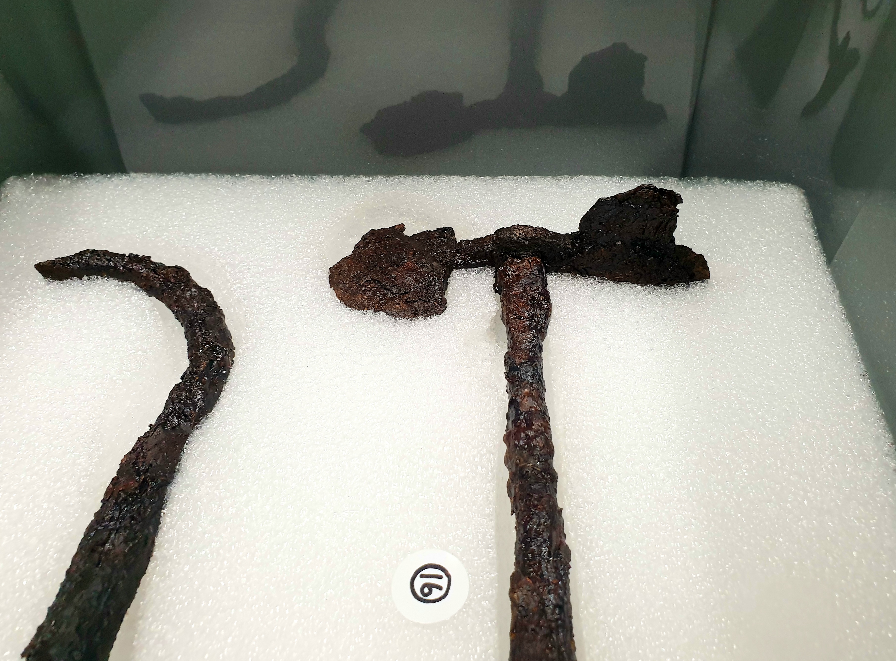 A stone mortar and a pestle were identified together right next to the iron pot inside of the chest at the buried person’s head.