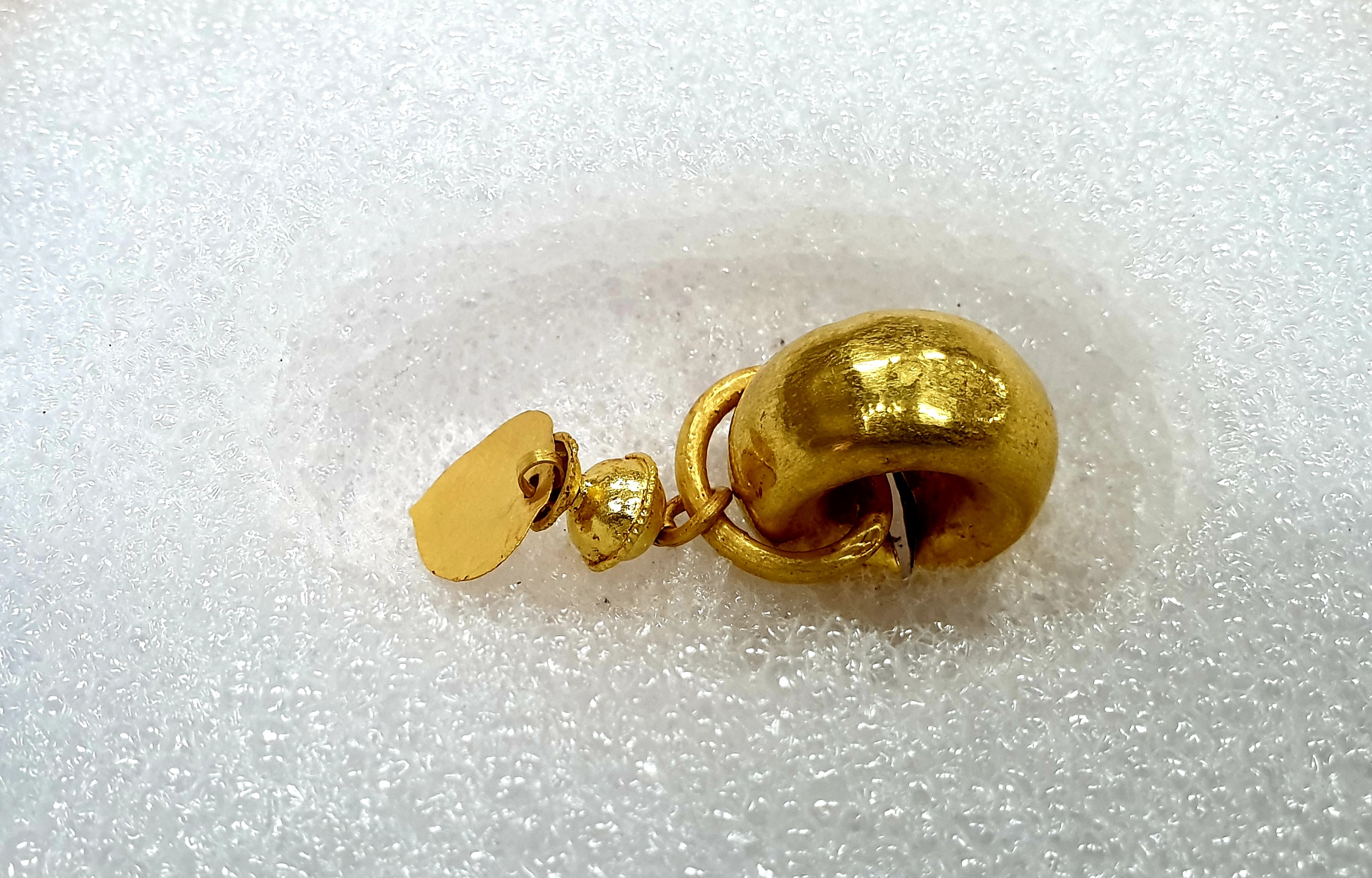 Overall small size of ornaments, including a gilt-bronze crown, earrings, bracelets and pendants for a belt, proves that the buried person is a woman.