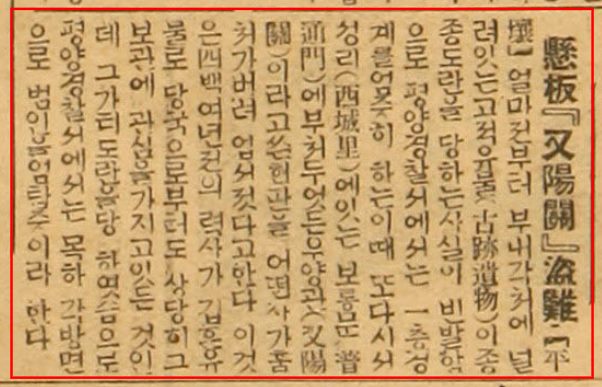 그들은 보통문 1층에 걸려있던 '우양관又陽關'이란 현판을 노렸다. 누가 탐을 냈는지는 몰라도, 돈을 꽤나 집어주고 명했을 테니 저 커다란 현판을 뜯어냈겠지.