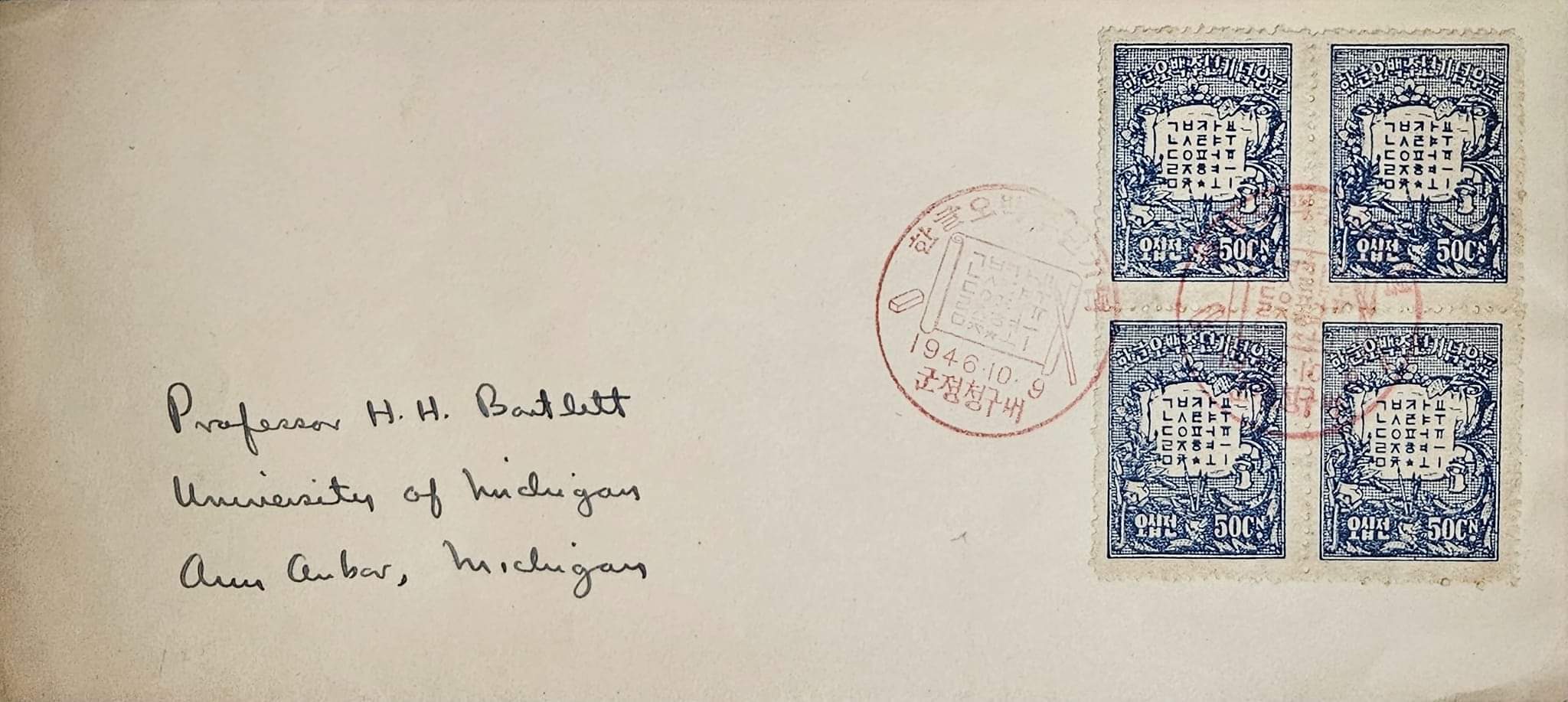 출장을 왔던지 여행인지, 조선에 왔는데 마침 그때가 1946년 10월 9일이렸다. 조선 알파벳을 만든 해를 기리기 위해 기념우표를 발행하고 기념 소인도 만들었다지 않은가.