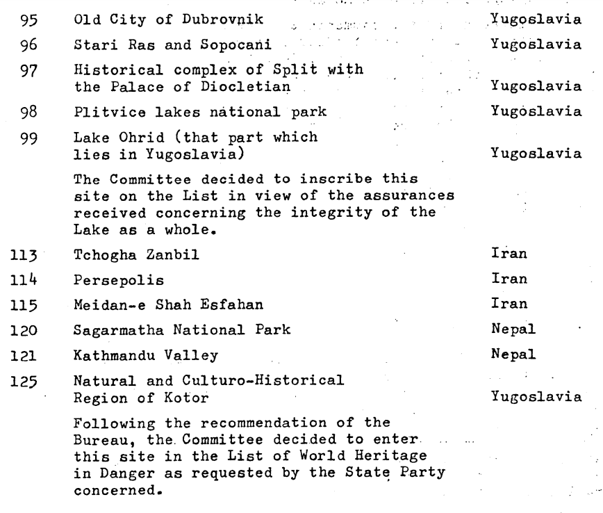6. 1978년과 1979년에는 우리가 생각하기에 비교적 의외인 국가나 의외인 유산들이 많이 등재되었다. 당시의 국력 영향인지, 이것도 냉전의 영향인지, 관심도의 차이인지, 학술적 의의인지, 등등 '원인'에 대한 추정은 독자의 몫.