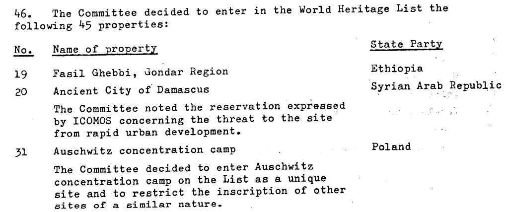 4. 아우슈비츠의 등재에는 단서가 달려 있다. The Committee decided to enter Auschwitz concentration camp on the List as a unique site and to restrict the inscriptionof other sites of a similar nature.