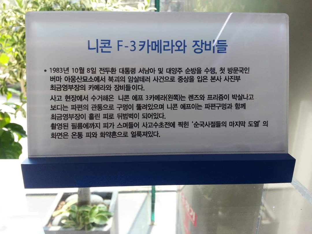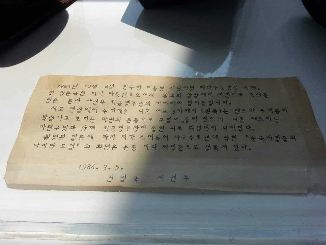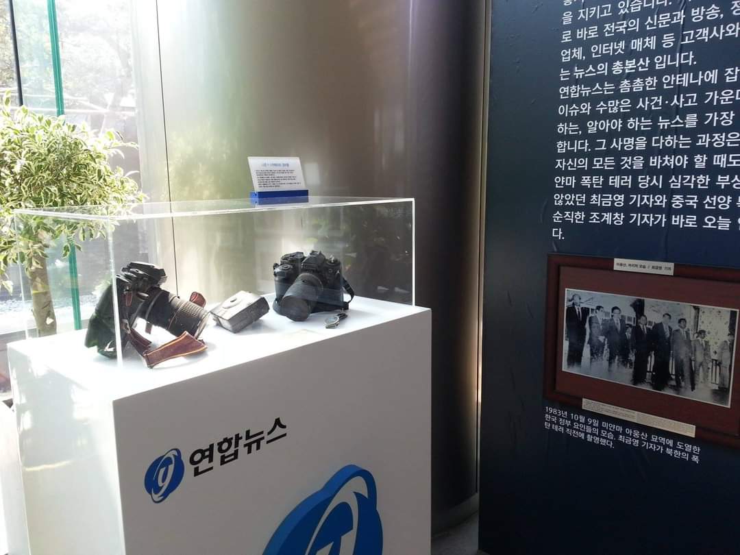 그 참사에서 기적으로 살아남은 이로 우리 공장 사진부 대선배 최금영 기자가 있다. 그는 폭발 직전 우리 정부 대표단이 묘지에 도열한 모습을 카메라에 포착했다. 폭발과 더불어 최 기자는 쓰러져 피투성이가 되었다.
