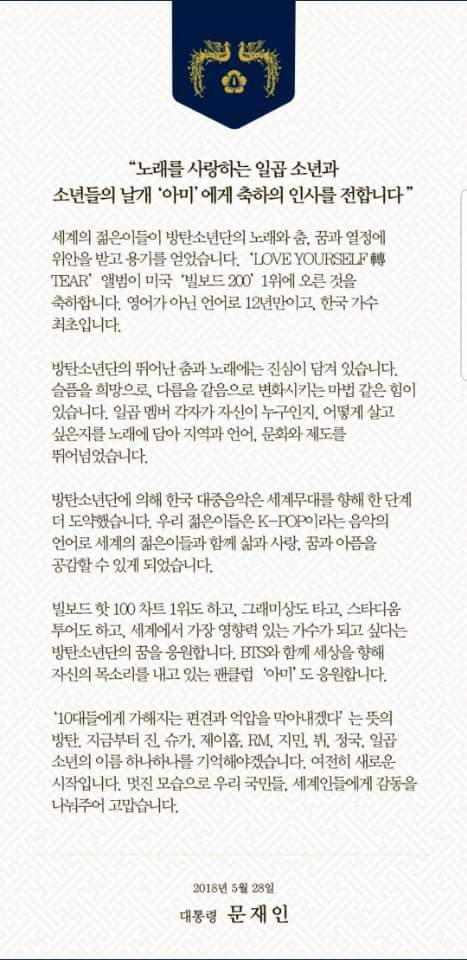 그들이 신보 《Love yourself 轉 tears》로 빌보드200 정상에 등극한 일은 한국대중음악사 혁명이었고 k-pop 새장을 열었다.