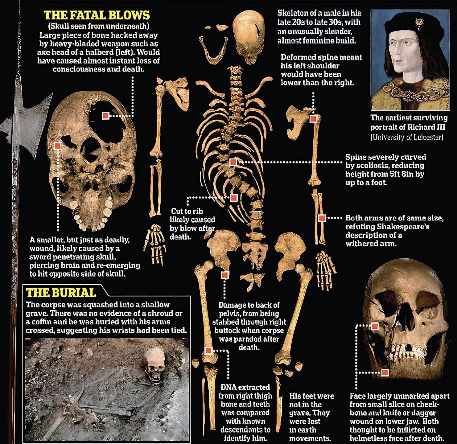 그 유해는 충격적인 진실을 드러냈다. 리처드는 실제로 심각한 척추측만증scoliosis을 앓고 있었는데, 이 척추는 상당한 통증을 일으켰을 것이고 한쪽 어깨를 다른 쪽 어깨보다 더 높게 만들었을 가능성이 있다.