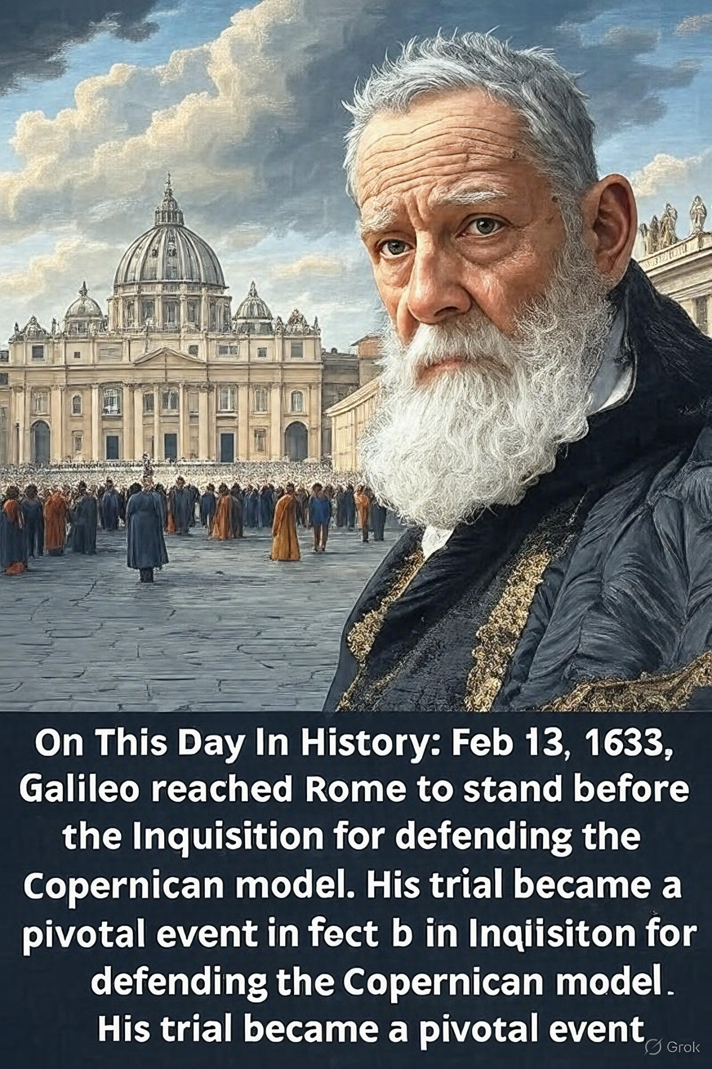 1633년 2월 13일, 갈릴레오 갈릴레이Galileo Galilei는 지구가 태양 주위를 공전한다는 태양 중심설heliocentric model을 지지했다는 이유로 로마 가톨릭 종교재판소Roman Catholic Inquisition에 재판을 받기 위해 로마에 도착했다.