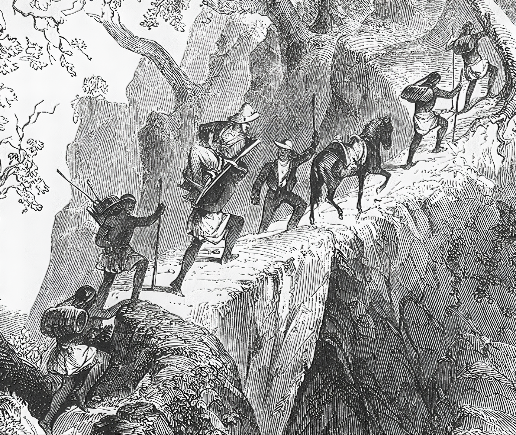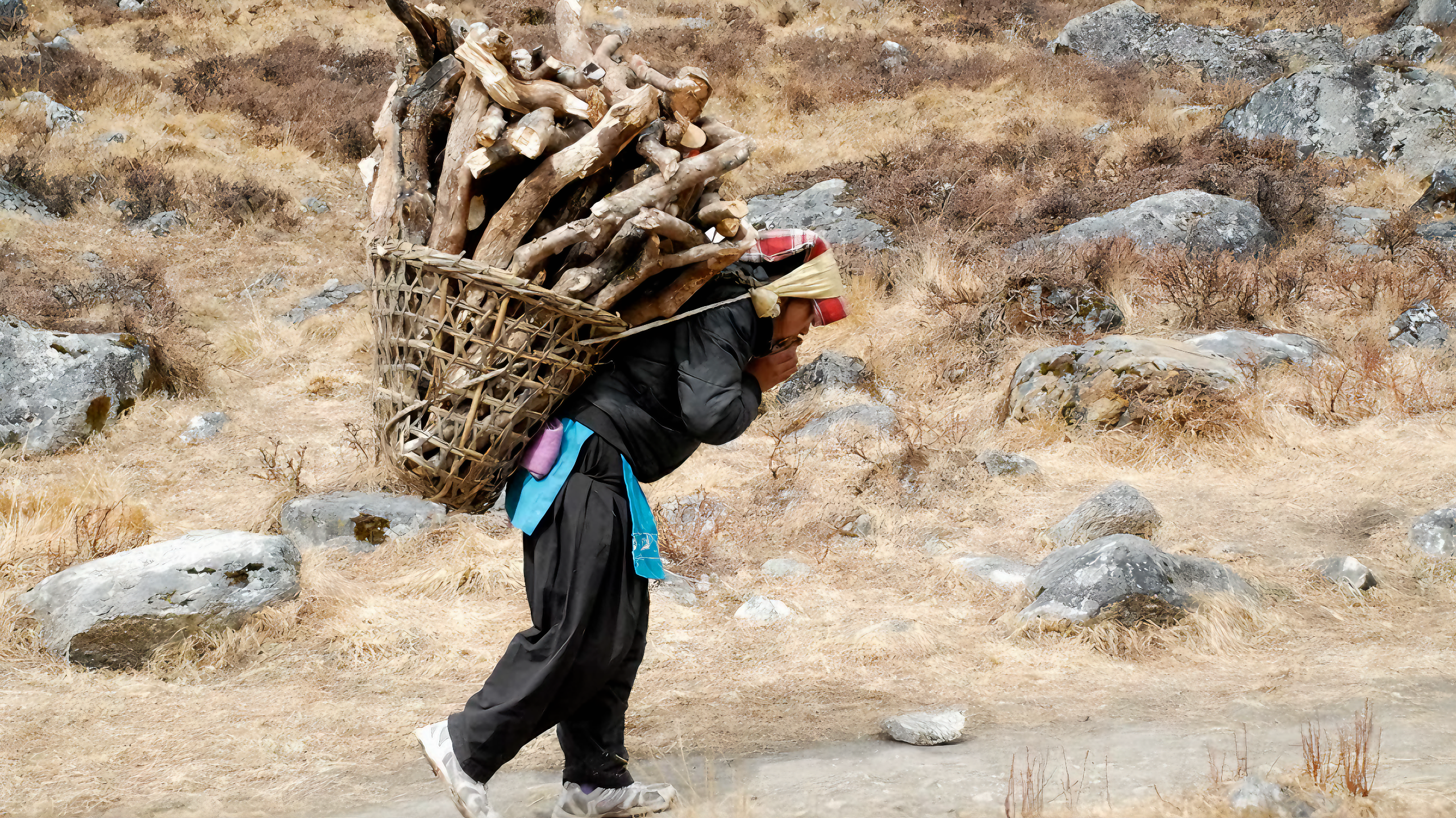 셀파 같은 사람들이 험준한 산길을 오르며 짐을 잔뜩 매고 간다.