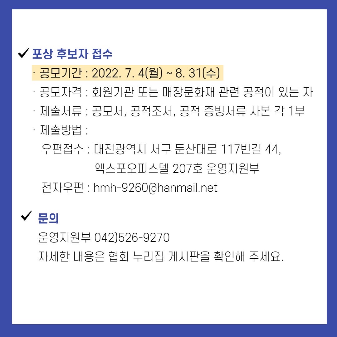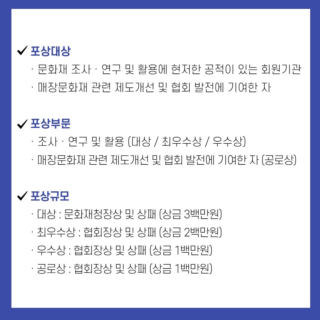 문화재 조사·연구 및 활용에 공적이 있는 회원기관을 선정·포상을 통해 학술활동을 증진하고, 문화재의 보존 및 보호에 기여하고자, 2022년도 문화재조사연구상 포상계획을 공고하오니, 관심 있는 회원기관의 많은 참여 바랍니다.