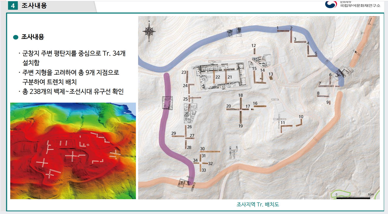 이번 조사는 향후 중·장기적으로 진행될 부소산성의 성내 평탄지 핵심 건물군을 확인하기 위한 사전조사로, 부소산성 남동쪽의 군창지부터 남서쪽의 반월루 주변까지 평탄지 전체 지역에 대한 조사 계획을 수립하기 위해 추진되었다.