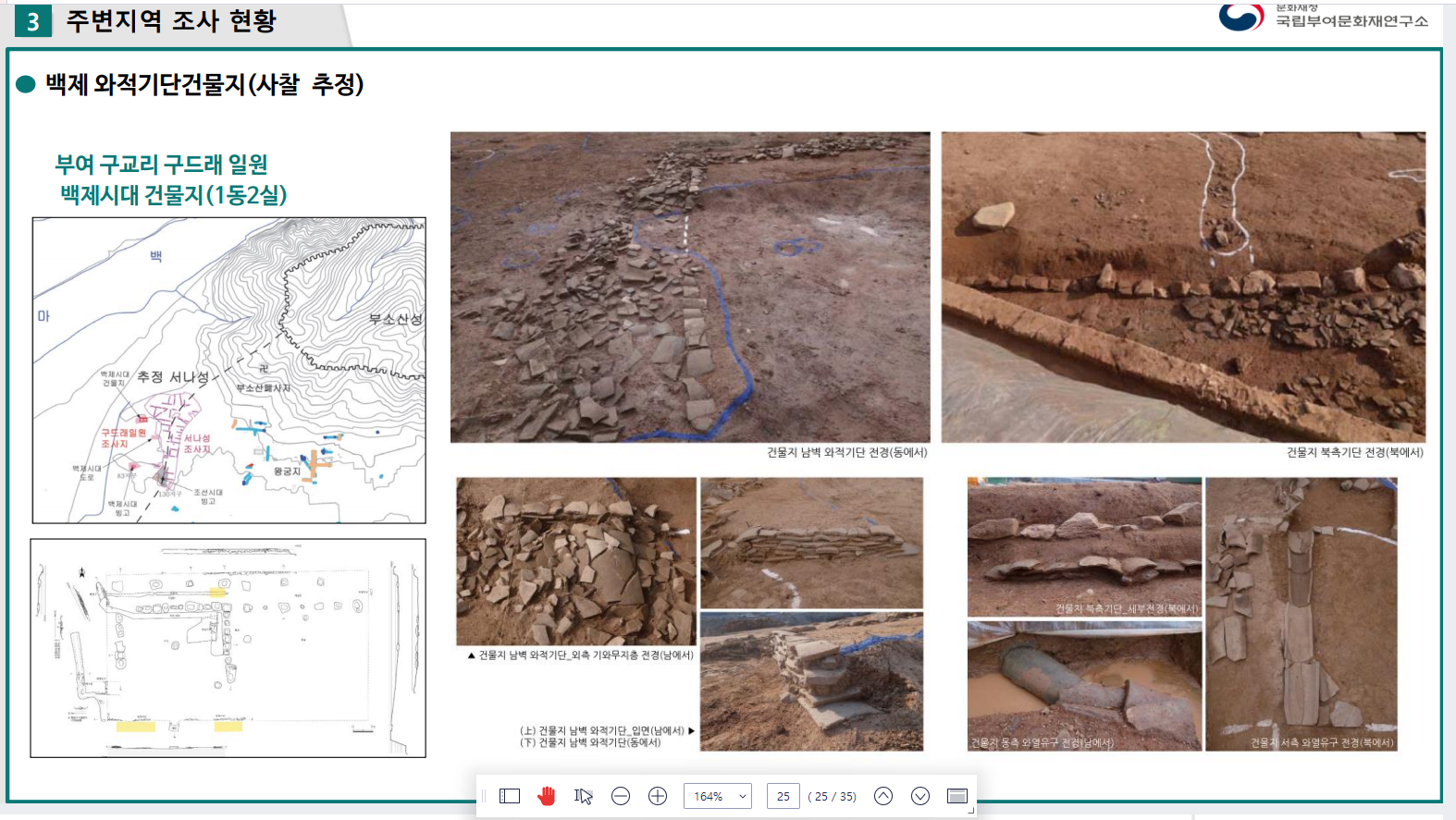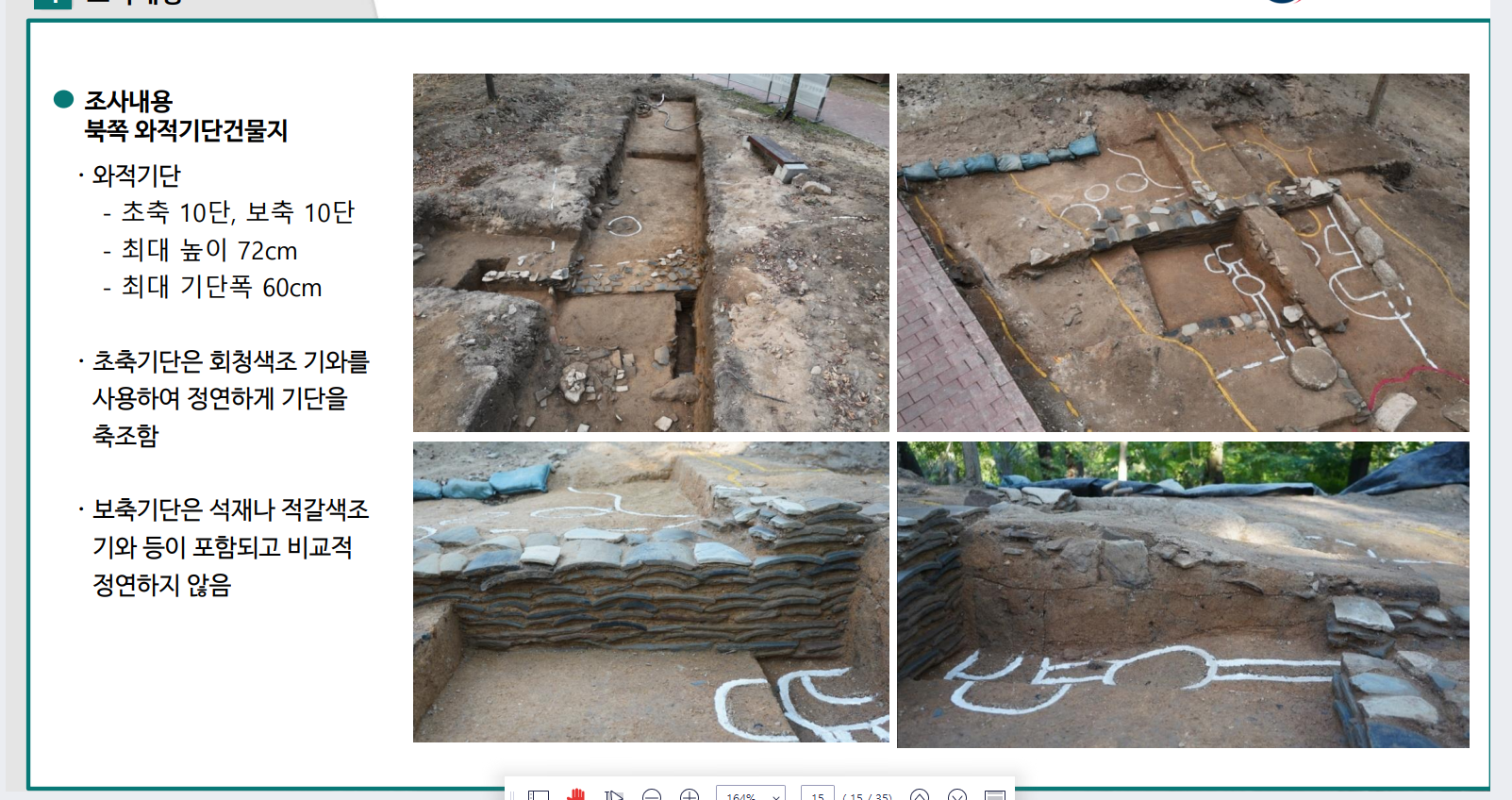 발굴성과는 이른바 언론계 용어로 야마를 잡을 수밖에 없는데, 이번 시굴에서 와적기단瓦積基壇이라 해서 백제시대 건물 흔적을 찾은 모양이라 그걸 내세웠다. 와적 기단이란 보나마나 왜놈들 용어를 그대로 빌려다 놓은 것으로, 글자 그대로 기와무지를 깔아 건물 기초로 활용한 것으로, 현재까지 발굴성과로 보면 삼국 중에서도 유독 백제 쪽에서, 그것도 대체로 사비시대에 집중으로 확인한다.