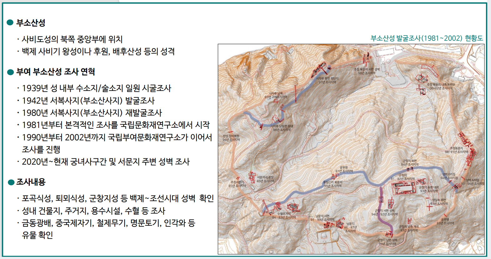 부여 부소산성은 백제 사비도성의 북쪽 중앙부에 위치하고 있는 산성으로 사비도읍기 왕성, 후원, 배후산성 등의 역할을 했던 곳으로 알려져 있다. 1981년부터 2002년까지 문화재청 국립문화재연구원(당시 국립문화재연구소)과 국립부여문화재연구소에서 발굴조사를 진행했으며, 당시 조사에서는 백제에서 조선시대에 이르는 성벽과 성내시설물(주거지, 저장구덩이, 우물지 등)이 확인된 바 있다.