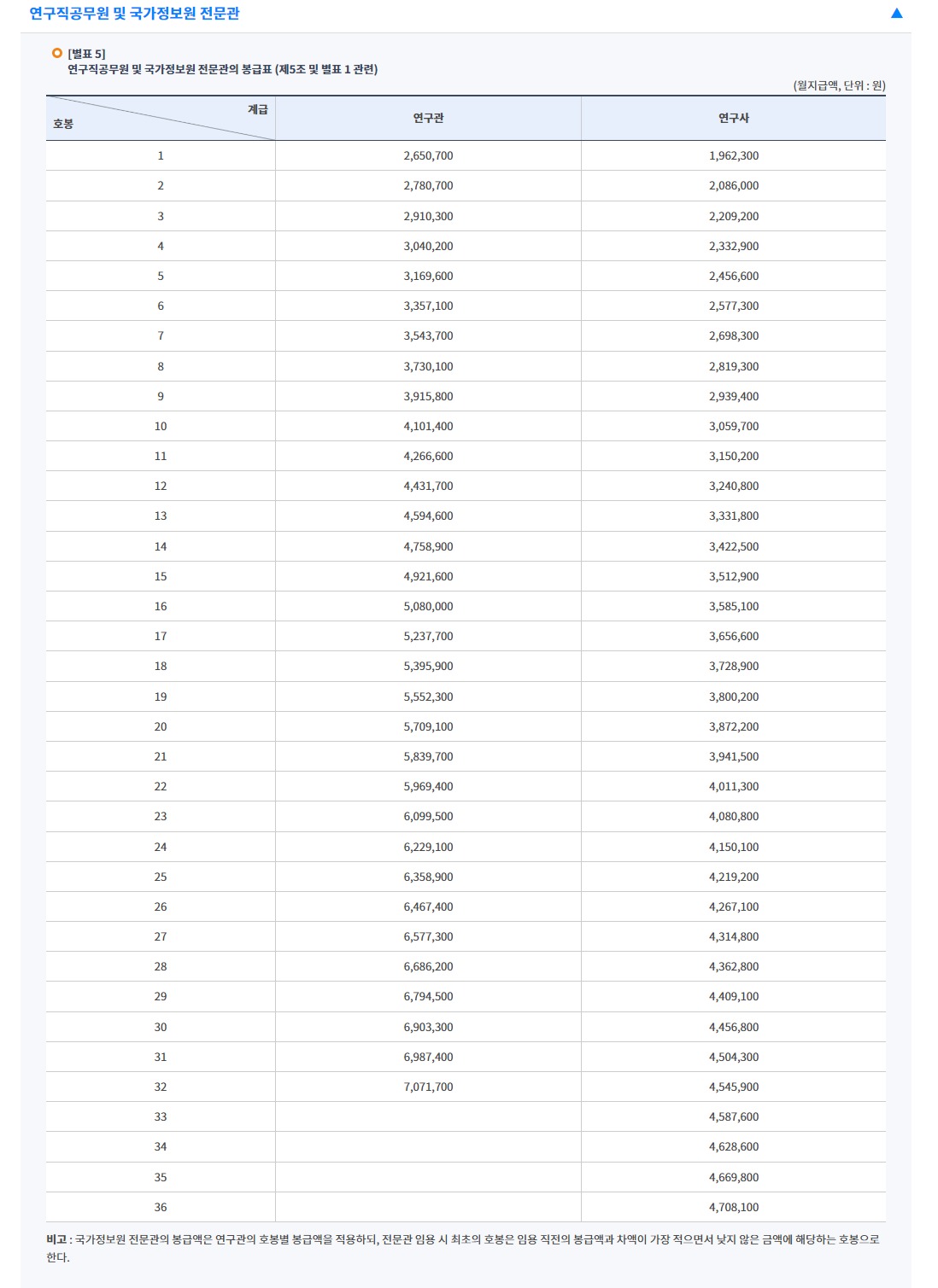 공무원 보수규정 [별표5]에 따른 2023년 연구직공무원 봉급표입니다.
