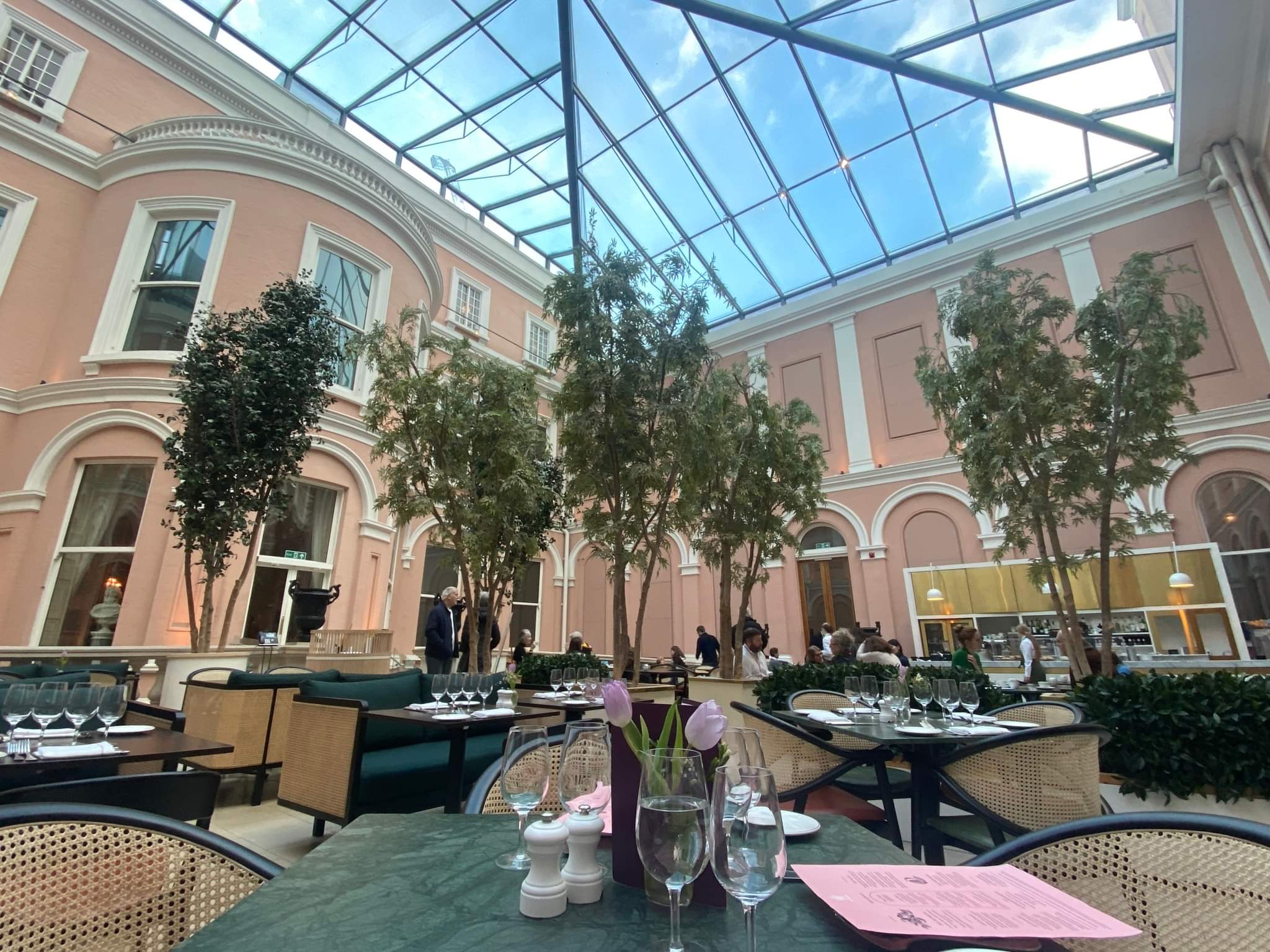 베이비 핑크색 건물에 둘러싸인 아담한 중정을 유리로 덮었다.