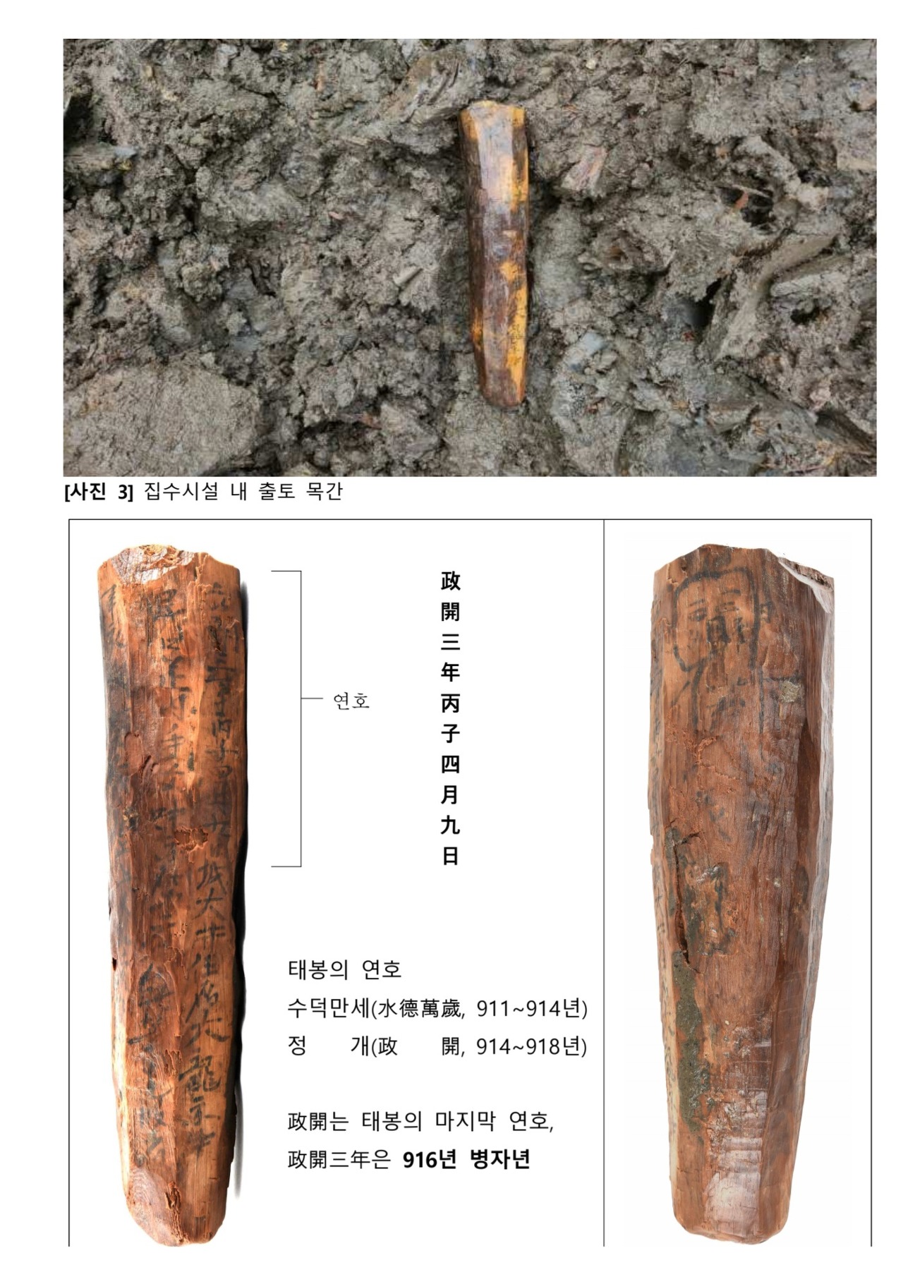 태봉이 사용한 정개政開라는 연호가 적힌 목간이 양주 대모산성에서 성내 상단부 집수시설에서 태봉국 연호를 묵글씨로 쓴 8면체 목간을 찾았다.