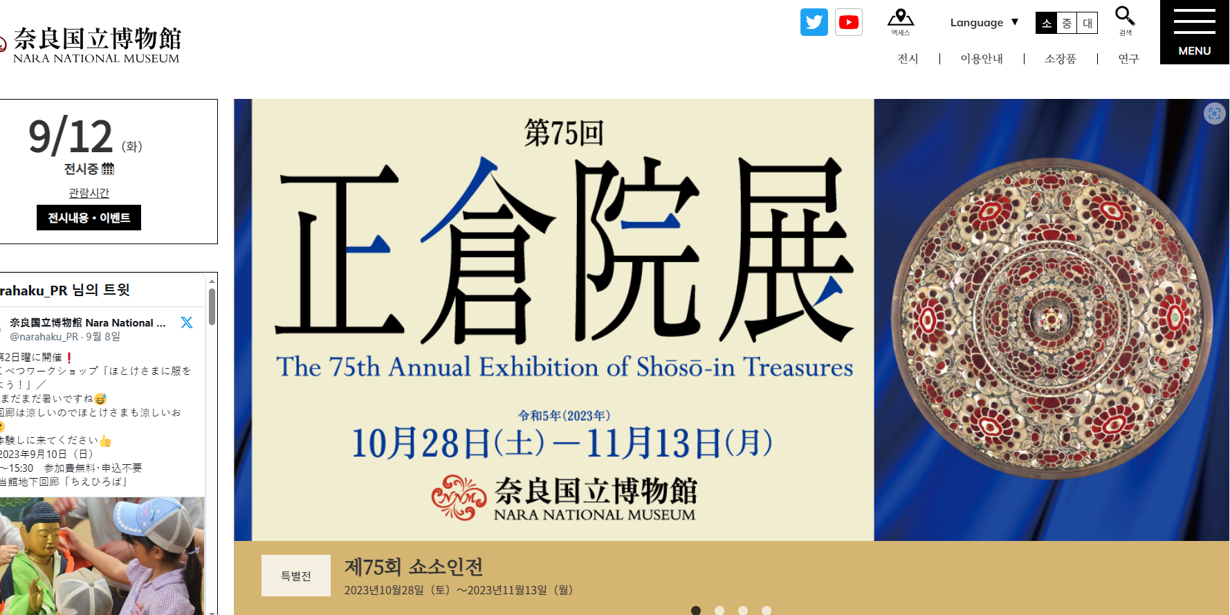 로손 티켓[L코드:59995][인터넷(https://l-tike.com/75shosoin-ten/), 로손 및 미니스톱 각 점포]※ 한국어 언어지원은 없다.